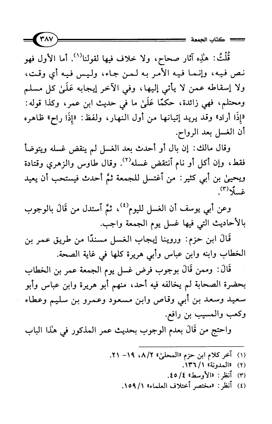 قَالَ: وممن قَالَ بوجوب فرض غسل يوم الجمعة عمر بن الخطاب بحضرة الصحابة لم يخالفه فيه أحد، منهم أبو هريرة وابن عباس وأبو سعيد وسعد بن أبي وقاص وابن مسعود وعمرو بن سليم وعطاء وكعب والمسيب بن رافع.