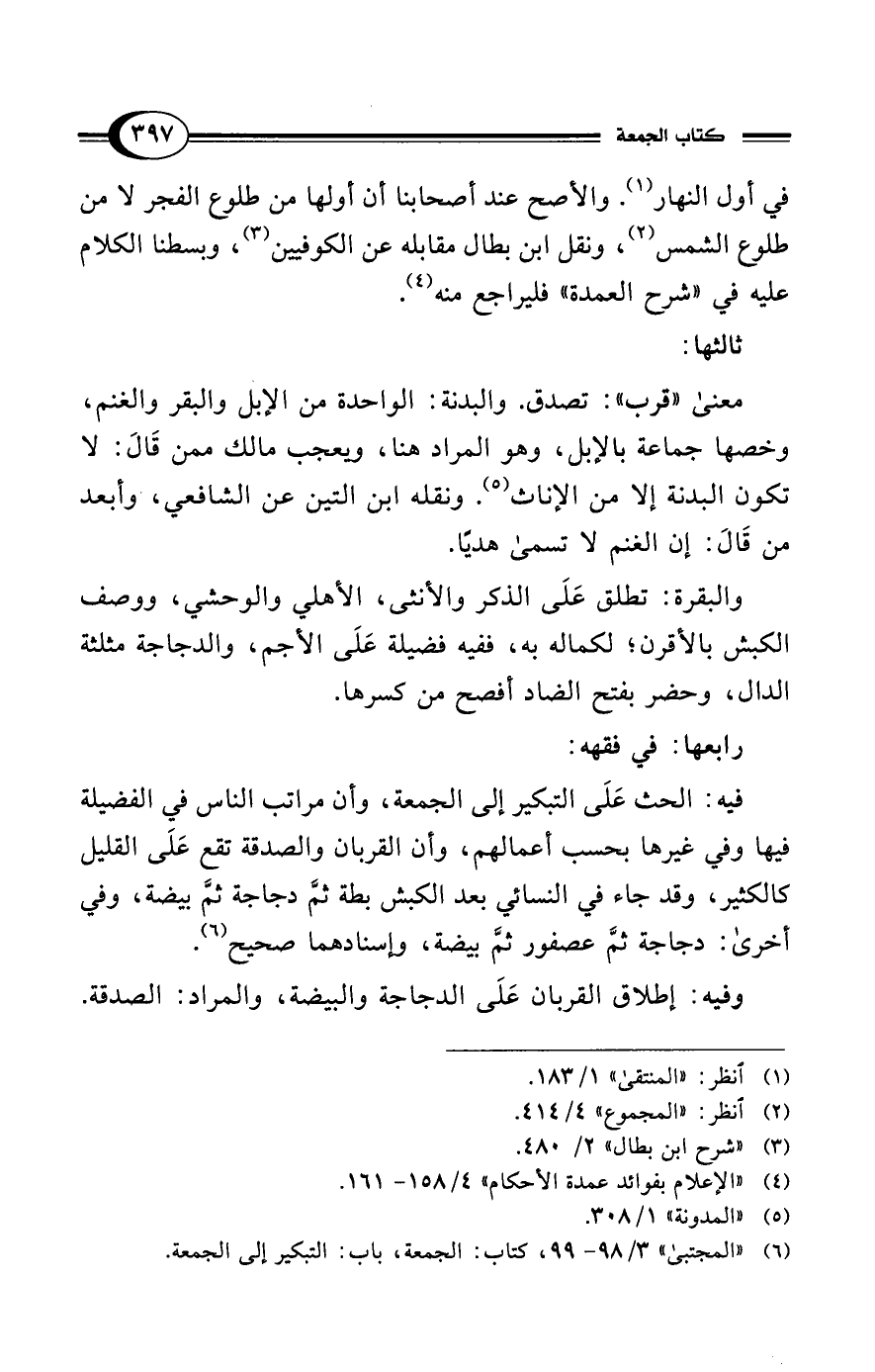 فيه: الحث عَلَى التبكير إلى الجمعة، وأن مراتب الناس في الفضيلة فيها وفي غيرها بحسب أعمالهم، وأن القربان والصدقة تقع عَلَى القليل كالكثير، وقد جاء في النسائي بعد الكبش بطة ثمَّ دجاجة ثمَّ بيضة، وفي أخرى: دجاجة ثمَّ عصفور ثمَّ بيضة، بإسنادهما صحيح (¬6).