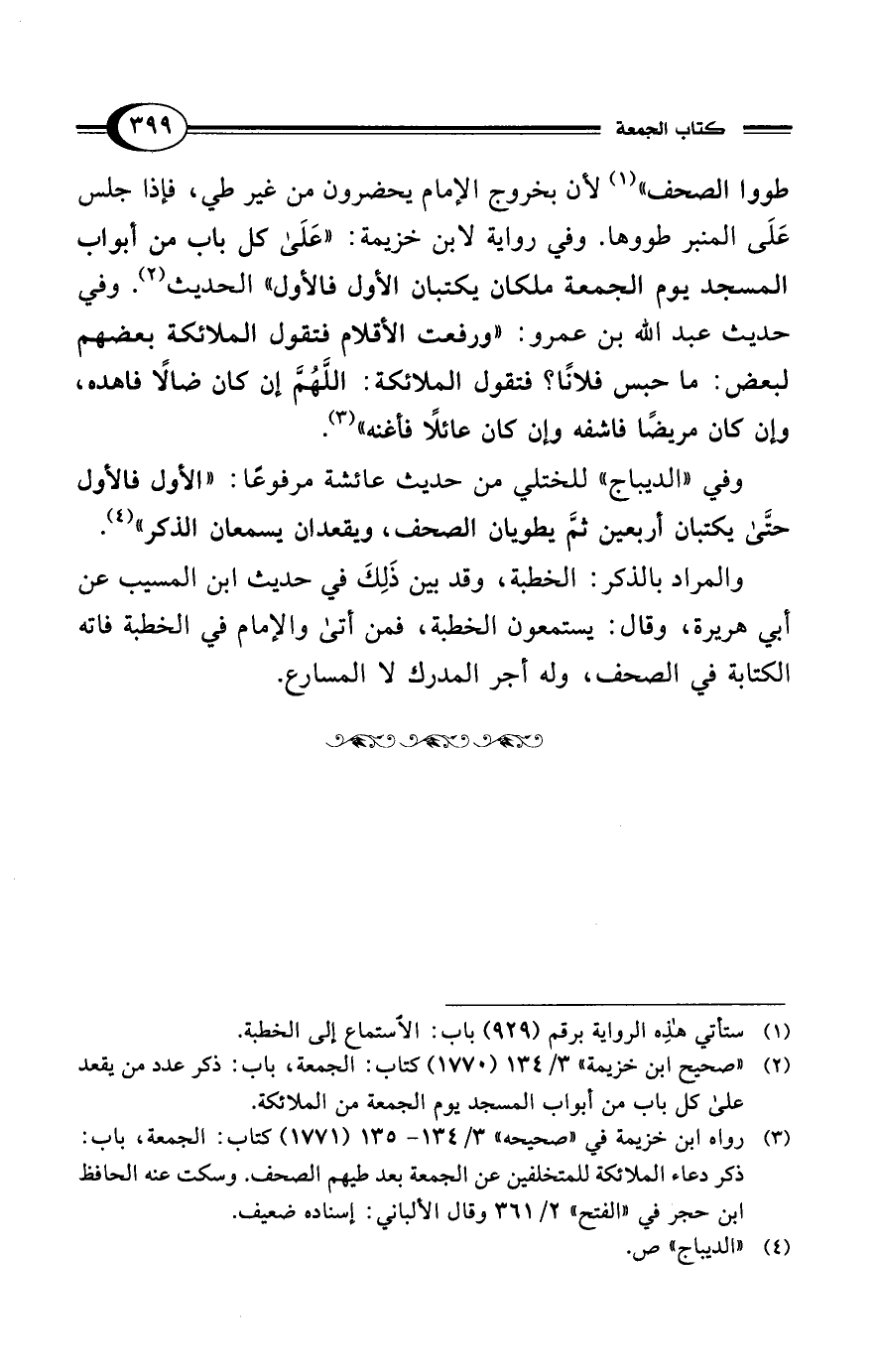 (¬2) "صحيح ابن خزيمة" 3/ 134 (1770) كتاب: الجمعة، باب: ذكر عدد من يقعد على كل باب من أبواب المسجد يوم الجمعة من الملائكة.