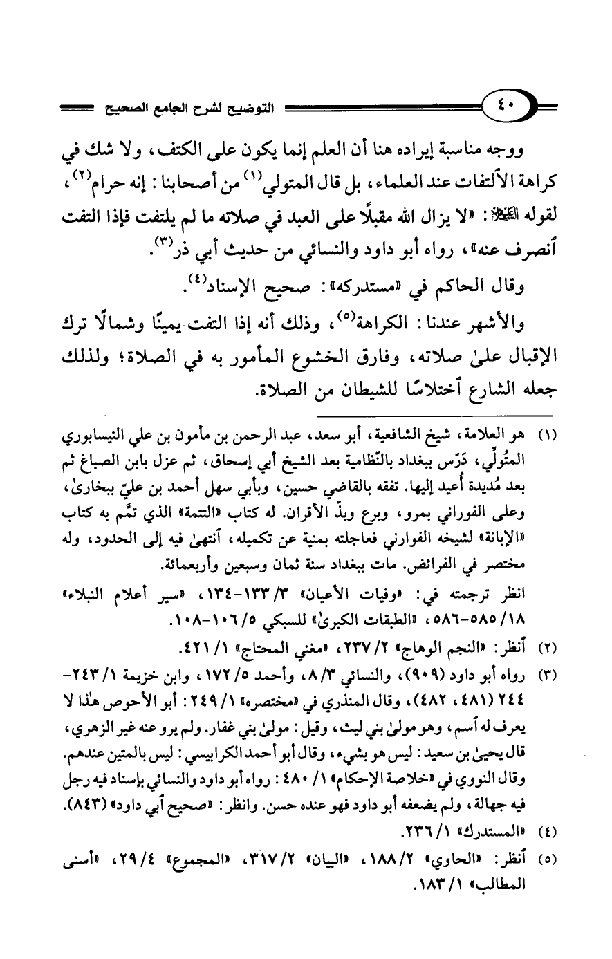 ووجه مناسبة إيراده هنا أن العلم إنما يكون على الكتف، ولا شك في كراهة الالتفات عند العلماء، بل قال المتولي (¬1) من أصحابنا: إنه حرام (¬2)، لقوله - عليه السلام -: "لا يزال الله مقبلًا على العبد في صلاته ما لم يلتفت فإذا التفت انصرف عنه"، رواه أبو داود والنسائي من حديث أبي ذر (¬3).