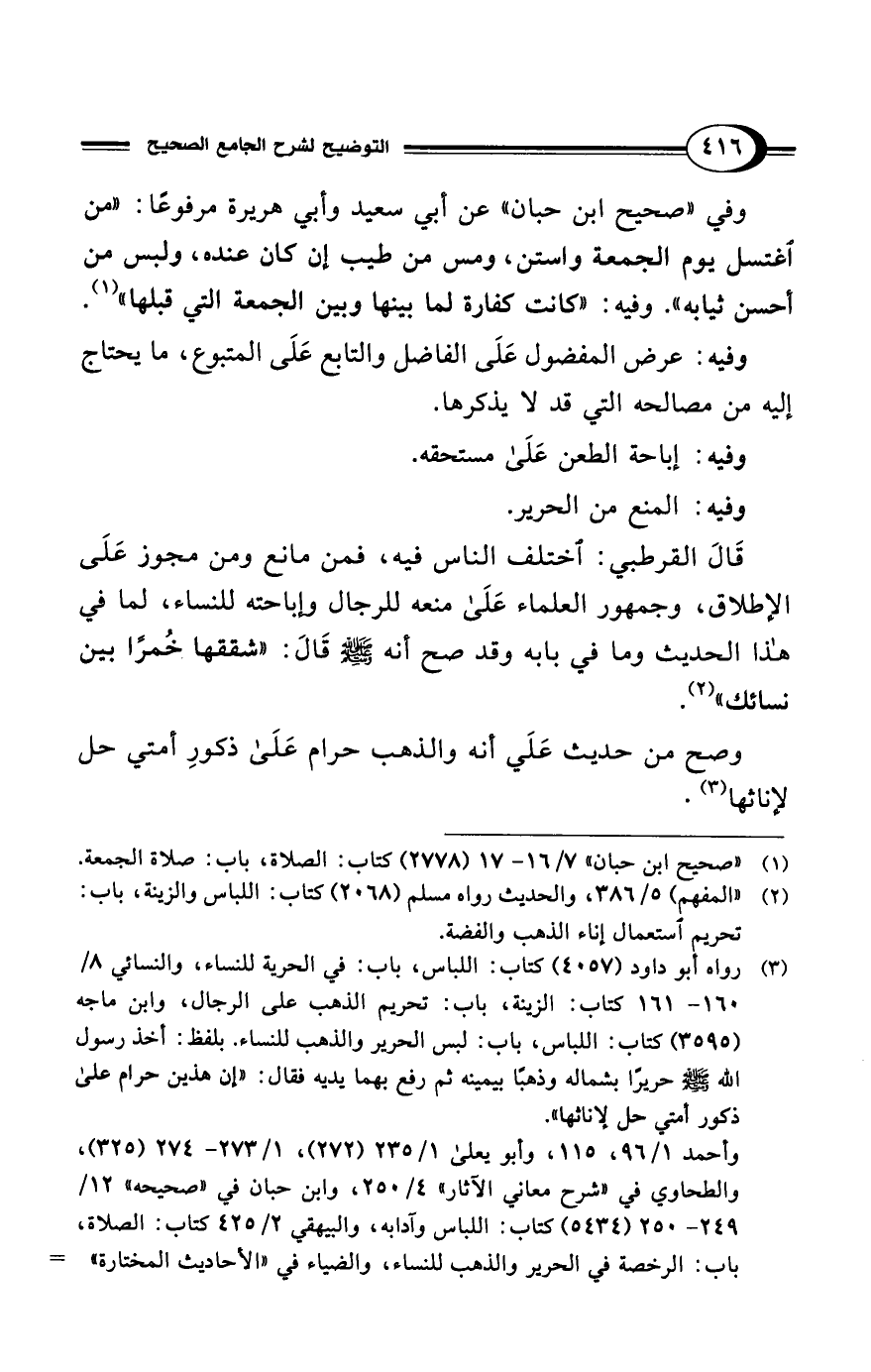 (¬3) رواه أبو داود (4057) كتاب: اللباس، باب: في الحرية للنساء، والنسائي 8/ 160 - 161 كتاب: الزينة، باب: تحريم الذهب على الرجال، وابن ماجه (3595) كتاب: اللباس، باب: لبس الحرير والذهب للنساء. بلفظ: أخذ رسول الله - صلى الله عليه وسلم - حريرًا بشماله وذهبًا بيمينه ثم رفع بهما يديه فقال: "إن هذين حرام على ذكور أمتي حل لإناثها".