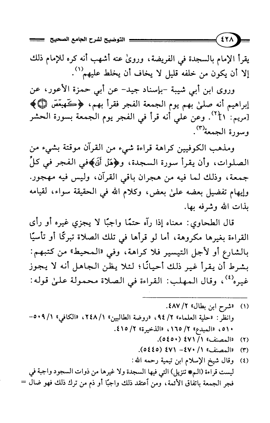 ومذهب الكوفيين كراهة قراءة شيء من القرآن موقتة بشيء من الصلوات، وأن يقرأ سورة السجدة، و {هَلْ أَتَى} في الفجر في كلِّ جمعة، وذلك لما فيه من هجران باقي القرآن، وليس فيه مهجور. وإيهام تفضيل بعضه على بعض، وكلام الله في الحقيقة سواء، لقيامه بذات الله وشرفه بها.