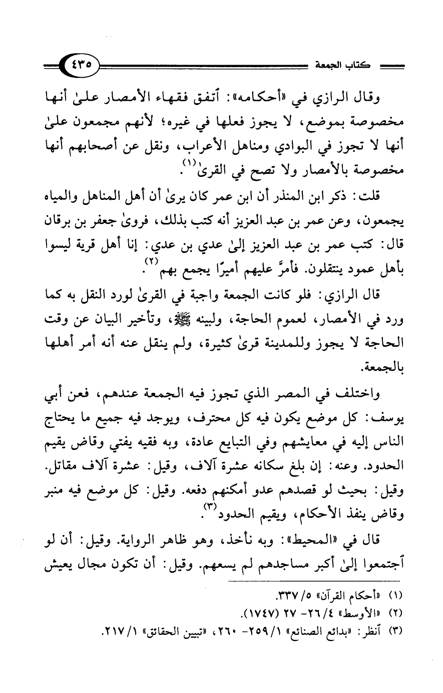 وقال الرازي في "أحكامه": اتفق فقهاء الأمصار على أنها مخصوصة بموضع، لا يجوز فعلها في غيره؛ لأنهم مجمعون على أنها لا تجوز في البوادي ومناهل الأعراب، ونقل عن أصحابهم أنها مخصوصة بالأمصار ولا تصح في القرى (¬1).