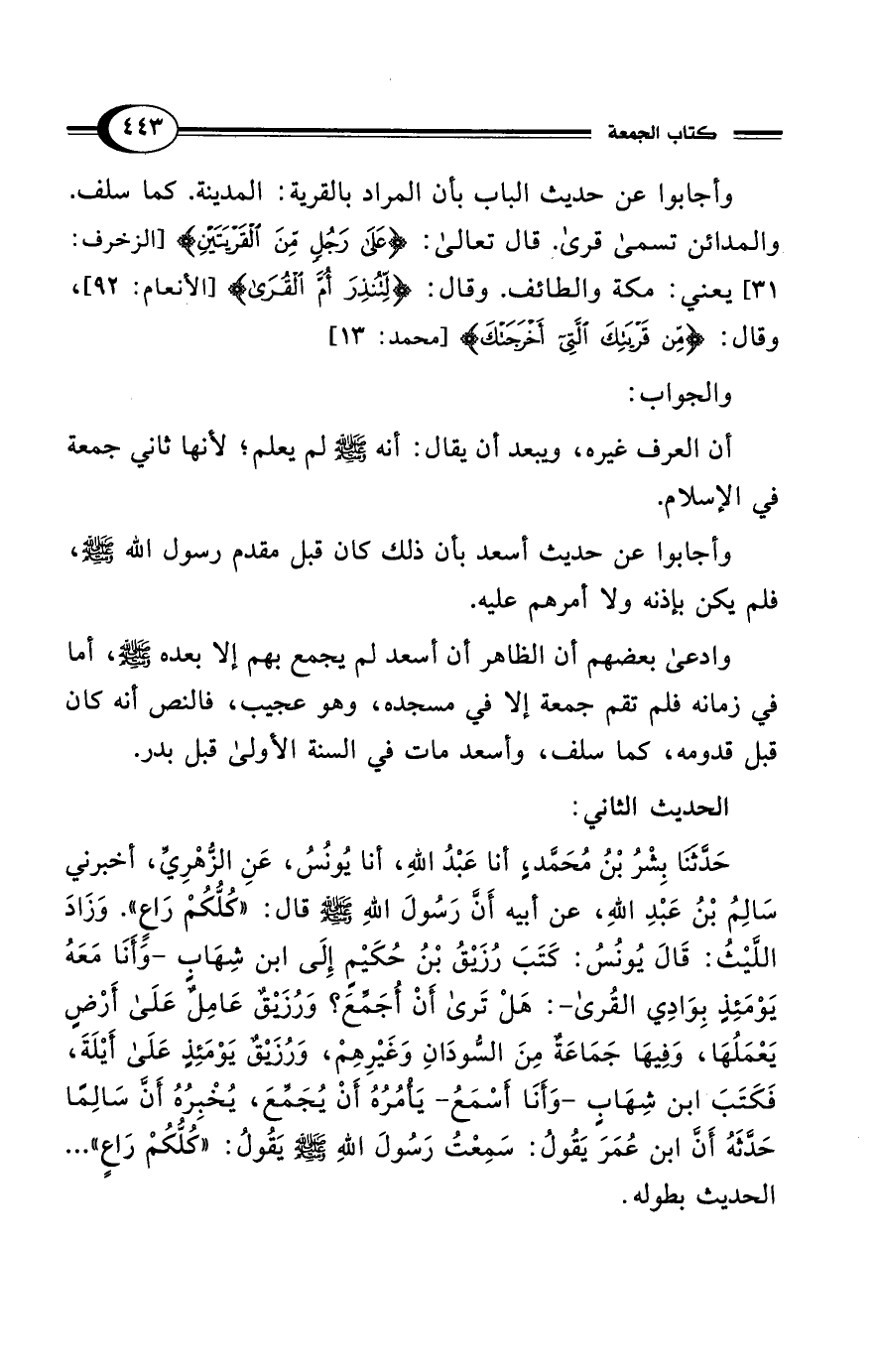 حَدَّثَنَا بِشْرُ بْنُ مُحَمَّدٍ، أنا عَبْدُ اللهِ، أنا يُونُسُ، عَنِ الزُّهْرِيِّ، أخبرني سَالِمُ بْنُ عَبْدِ اللهِ، عن أبيه أَنَّ رَسُولَ اللهِ - صلى الله عليه وسلم - قال: "كُلُّكُمْ رَاعٍ". وَزَادَ اللَّيْثُ: قَالَ يُونُسُ: كَتَبَ رُزيقُ بْنُ حُكَيْمٍ إِلَى ابن شِهَابٍ -وَأَنَا مَعَهُ يَوْمَئِذٍ بِوَادِي القُرى-: هَلْ تَرى أَنْ أُجَمِّعَ؟ وَرُزيقٌ عَامِلٌ عَلَى أَرْضٍ يَعْمَلُهَا، وَفِيهَا جَمَاعَةٌ مِنَ السُّودَانِ وَغَيْرِهِمْ، وَرُزيقٌ يَوْمَئِذٍ عَلَى أَيْلَةَ، فَكَتَبَ ابن شِهَابٍ -وَأَنَا أَسْمَعُ- يَأُمُرُهُ أَنْ يُجَمِّعَ، يُخْبِرُهُ أَنَّ سَالِمًا حدَّثهُ أَنَّ ابن عُمَرَ يَقُولُ: سَمِعْتُ رَسُولَ اللهِ - صلى الله عليه وسلم - يَقُولُ: "كلُّكُمْ رَاعٍ" ... الحديث بطوله.