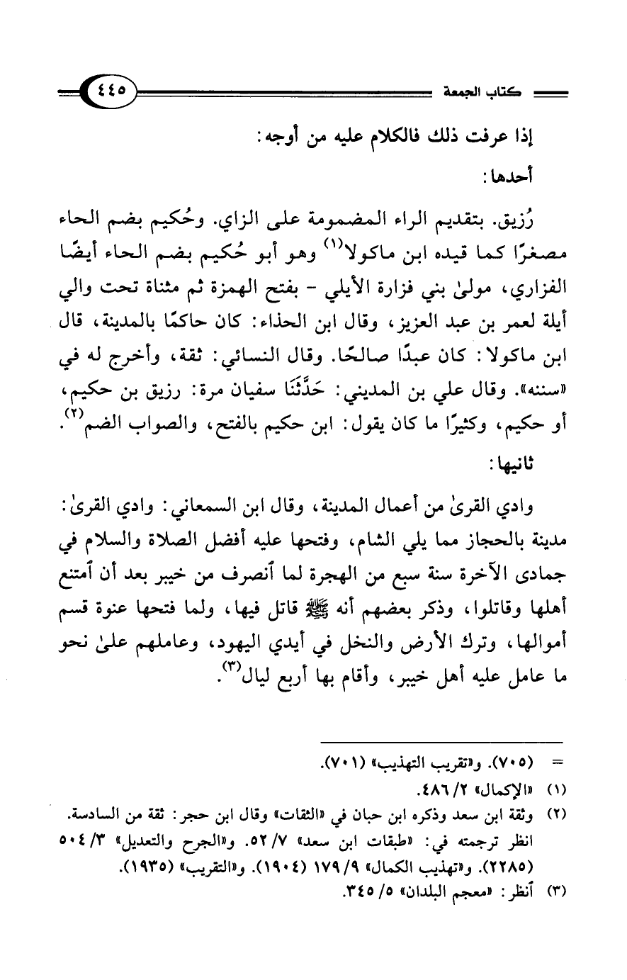 رُزيق. بتقديم الراء المضمومة على الزاي. وحُكيم بضم الحاء مصغرًا كما قيده ابن ماكولا (¬1) وهو أبو حُكيم بضم الحاء أيضًا الفزاري، مولى بني فزارة الأيلي -بفتح الهمزة ثم مثناة تحت والي أيلة لعمر بن عبد العزيز، وقال ابن الحذاء: كان حاكمًا بالمدينة، قال ابن ماكولا: كان عبدًا صالحًا. وقال النسائي: ثقة، وأخرج له في "سننه". وقال علي بن المديني: حَدَّثَنَا سفيان مرة: رزيق بن حكيم، أو حكيم، وكثيرًا ما كان يقول: ابن حكيم بالفتح، والصواب الضم (¬2).
