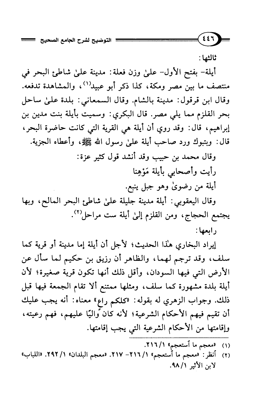 أيلة -بفتح الأول- على وزن فعلة: مدينة على شاطئ البحر في منتصفج ما بين مصر ومكة، كذا ذكر أبو عبيد (¬1)، والمشاهدة تدفعه.