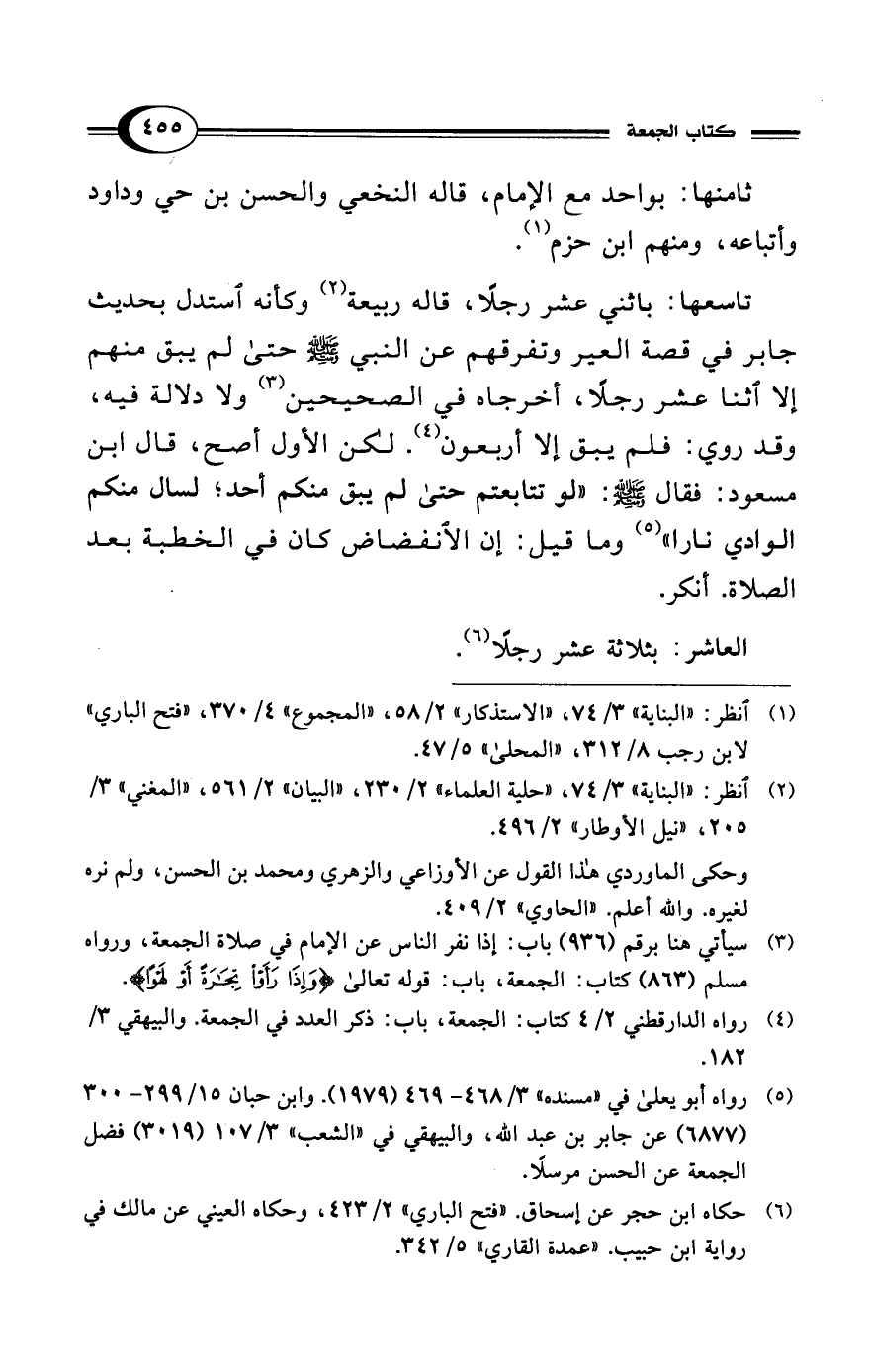 تاسعها: باثني عشر رجلًا، قاله ربيعة (¬2) وكأنه استدل بحديث جابر في قصة العير وتفرقهم عن النبي - صلى الله عليه وسلم - حتى لم يبق منهم إلا اثنا عشر رجلًا، أخرجاه في الصحيحين (¬3) ولا دلالة فيه، وقد روي: فلم يبق إلا أربعون (¬4). لكن الأول أصح، قال ابن مسعود: فقال - صلى الله عليه وسلم -: "لو تتابعتم حتى لم يبق منكم أحد؛ لسال منكم الوادي نارا" (¬5) وما قيل: إن الانفضاض كان في الخطبة بعد الصلاة. أنكر.