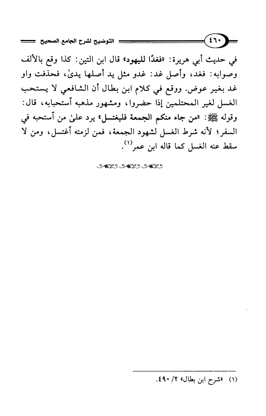 في حديث أبي هريرة: "فغدًا لليهود" قال ابن التين: كذا وقع بالألف وصوابه: فغد، وأصل غد: غدو مثل يد أصلها يدي، فحذفت واو غد بغير عوض. ووقع في كلام ابن بطال أن الشافعي لا يستحب الغسل لغير المحتلمين إذا حضروا، ومشهور مذهبه ستحبابه، قال: وقوله - صلى الله عليه وسلم -: "من جاء منكم الجمعة فليغتسل" يرد على من استحبه في السفر؛ لأنه شرط الغسل لشهود الجمعة، فمن لزمته اغتسل، ومن لا سقط عنه الغسل كما قاله ابن عمر (¬1).