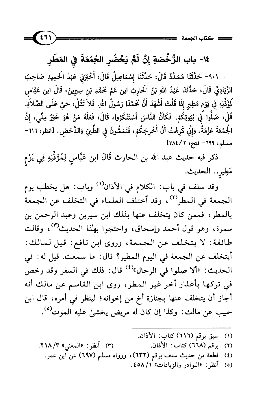901 - حَدَّثَنَا مُسَدَّدٌ قَالَ: حَدَّثَنَا إِسْمَاعِيلُ قَالَ: أَخْبَرَنِي عَبْدُ الحَمِيدِ صَاحِبُ الزِّيَادِيِّ قَالَ: حَدَّثَنَا عَبْدُ اللهِ بْنُ الحَارِثِ ابْنُ عَمِّ مُحَمَّدِ بْنِ سِيرِينَ: قَالَ ابْنُ عَبَّاسٍ لِمُؤَذِّنِهِ فِي يَوْمٍ مَطِيرٍ إِذَا قُلْتَ أَشْهَدُ أَنَّ مُحَمَّدًا رَسُولُ اللهِ. فَلاَ تَقُلْ: حَيَّ عَلَى الصَّلاَةِ. قُلْ: صَلُّوا فِي بُيُوتِكُمْ. فَكَأَنَّ النَّاسَ اسْتَنْكَرُوا، قَالَ: فَعَلَهُ مَنْ هُوَ خَيْرٌ مِنِّي، إِنَّ الجُمُعَةَ عَزْمَةٌ، وَإِنِّي كَرِهْتُ أَنْ أُخْرِجَكُمْ، فَتَمْشُونَ فِي الطِّينِ وَالدَّحْضِ. [انظر: 616 - مسلم: 699 - فتح: 2/ 384]
