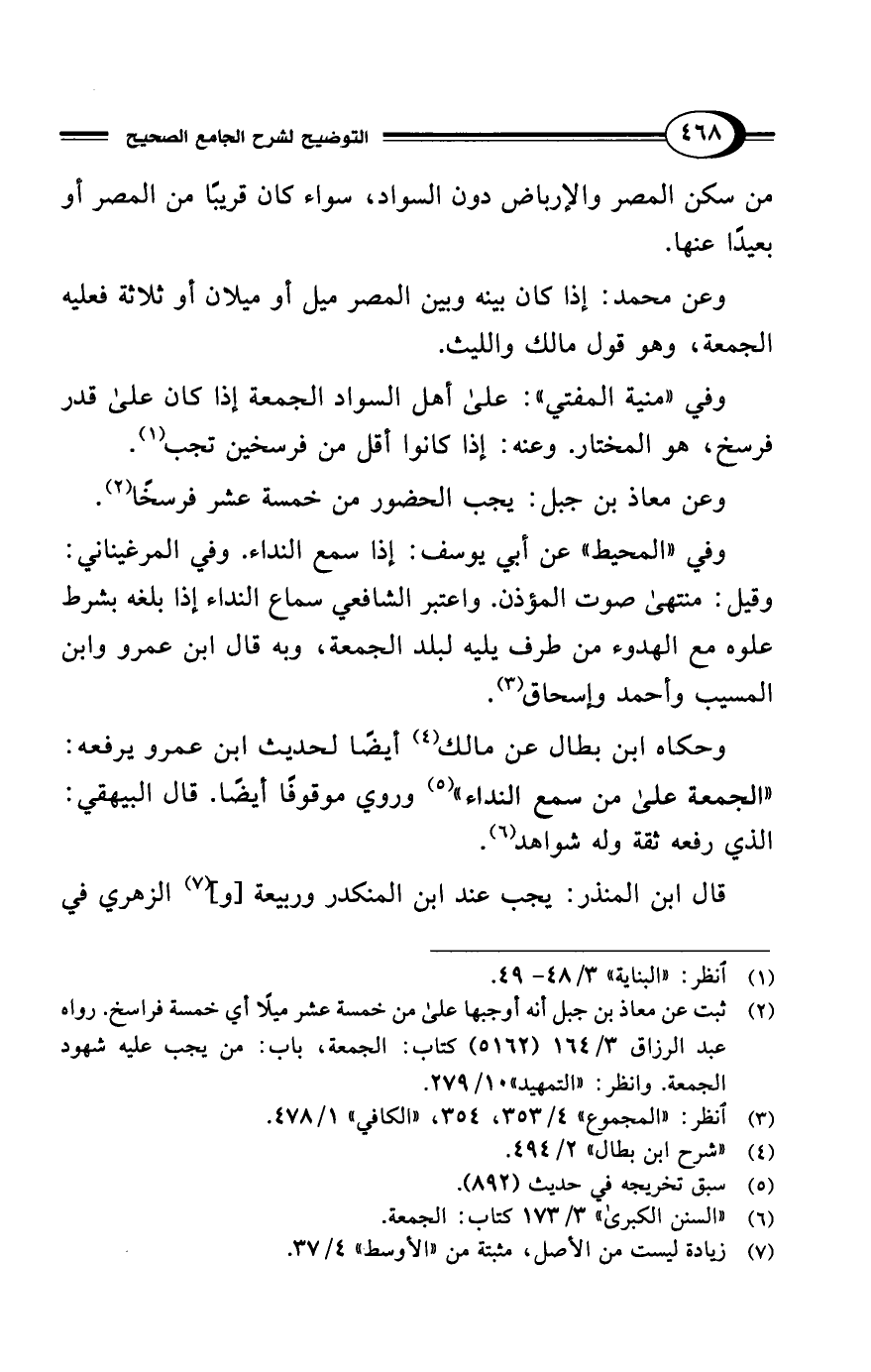 (¬2) ثبت عن معاذ بن جبل أنه أوجبها على من خمسة عشر ميلًا أي خمسة فراسخ. رواه عبد الرزاق 3/ 164 (5162) كتاب: الجمعة، باب: من يجب عليه شهود الجمعة. وانظر: "التمهيد" 10/ 279.