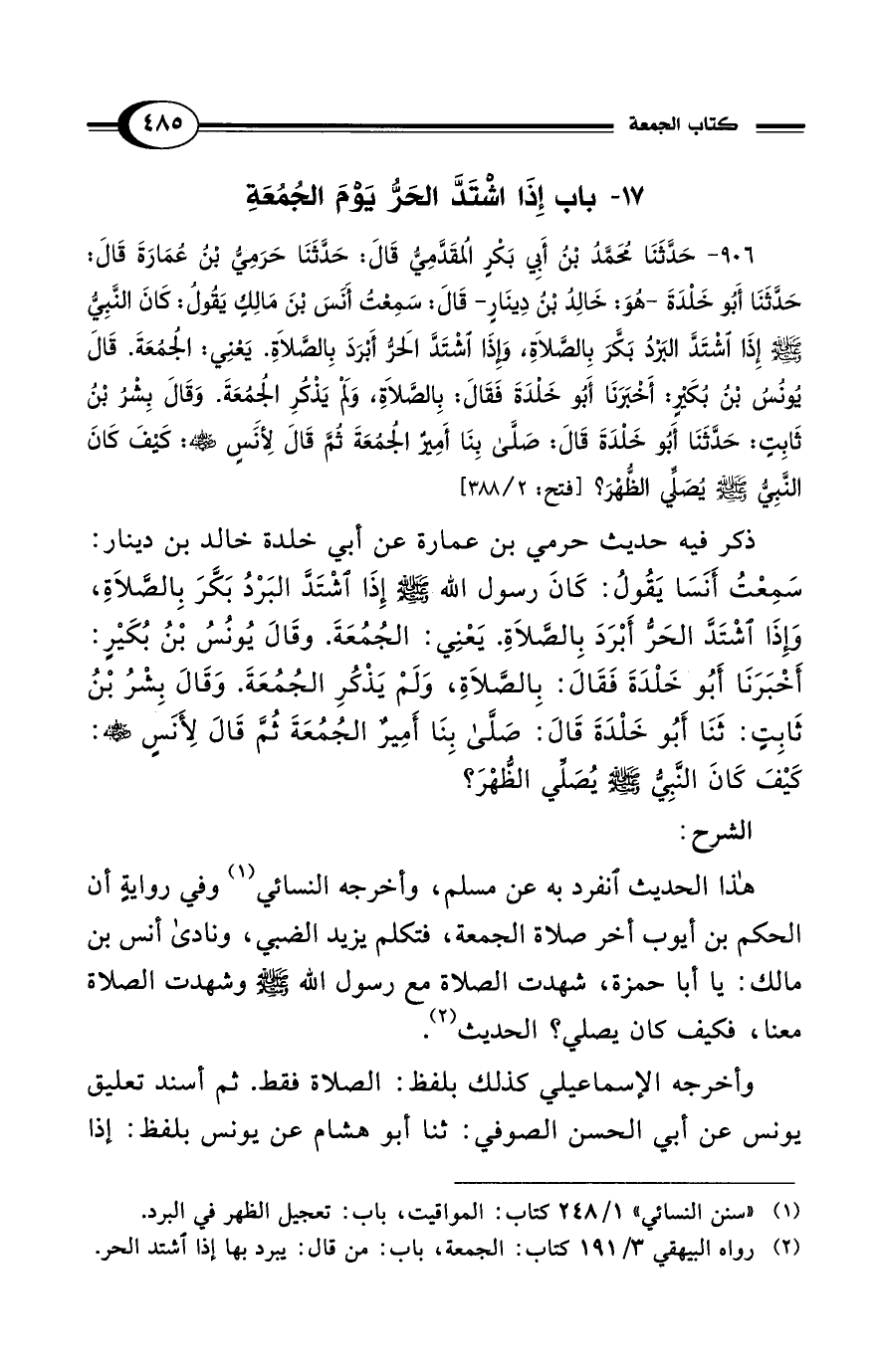906 - حَدَّثَنَا مُحَمَّدُ بْنُ أَبِي بَكْرٍ المُقَدَّمِيُّ قَالَ: حَدَّثَنَا حَرَمِيُّ بْنُ عُمَارَةَ قَالَ: حَدَّثَنَا أَبُو خَلْدَةَ -هُوَ: خَالِدُ بْنُ دِينَارٍ- قَالَ: سَمِعْتُ أَنَسَ بْنَ مَالِكٍ يَقُولُ: كَانَ النَّبِيُّ - صلى الله عليه وسلم - إِذَا اشْتَدَّ البَرْدُ بَكَّرَ بِالصَّلاَةِ، وَإِذَا اشْتَدَّ الحَرُّ أَبْرَدَ بِالصَّلاَةِ، يَعْنِى: الجُمُعَةَ. قَالَ يُونُسُ بْنُ بُكَيْرٍ: أَخْبَرَنَا أَبُو خَلْدَةَ فَقَالَ: بِالصَّلاَةِ، وَلَمْ يَذْكُرِ الجُمُعَةَ. وَقَالَ بِشْرُ بْنُ ثَابِتٍ: حَدَّثَنَا أَبُو خَلْدَةَ قَالَ: صَلَّى بِنَا أَمِيرٌ الجُمُعَةَ ثُمَّ قَالَ لأَنَسٍ - رضي الله عنه -: كَيْفَ كَانَ النَّبِيُّ - صلى الله عليه وسلم - يُصَلِّي الظُّهْرَ؟ [فتح: 2/ 388]