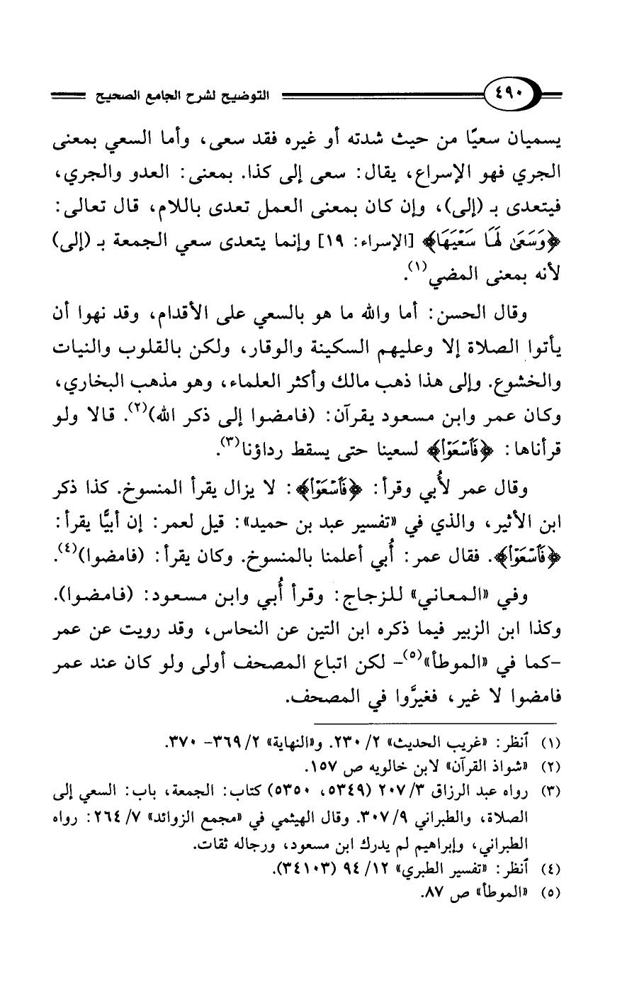 وقال عمر لأُبي وقرأ: {فَاسْعَوْا}: لا يزال يقرأ المنسوخ. كذا ذكر ابن الأثير، والذي في "تفسير عبد بن حميد": قيل لعمر: إن أبيًّا يقرأ: {فَاسْعَوْا}. فقال عمر: أُبي أعلمنا بالمنسوخ. وكان يقرأ: (فامضوا) (¬4).
