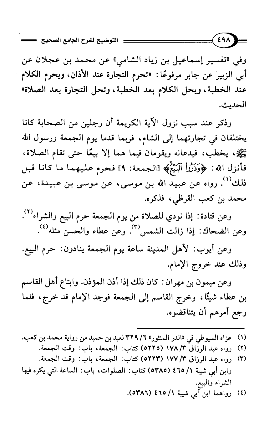 وذكر عند سبب نزول الآية الكريمة أن رجلين من الصحابة كانا يختلفان في تجارتهما إلى الشام، فربما قدما يوم الجمعة ورسول الله - صلى الله عليه وسلم -، يخطب، فيدعانه ويقومان فيما هما إلا بيعًا حتى تقام الصلاة، فأنزل الله: {وَذَرُوا البَيْعَ} [الجمعة: 9] فحرم عليهما ما كانا قبل ذلك (¬1). رواه عن عبيد الله بن موسى، عن موسى بن عبيدة، عن محمد بن كعب القرظي، فذكره.