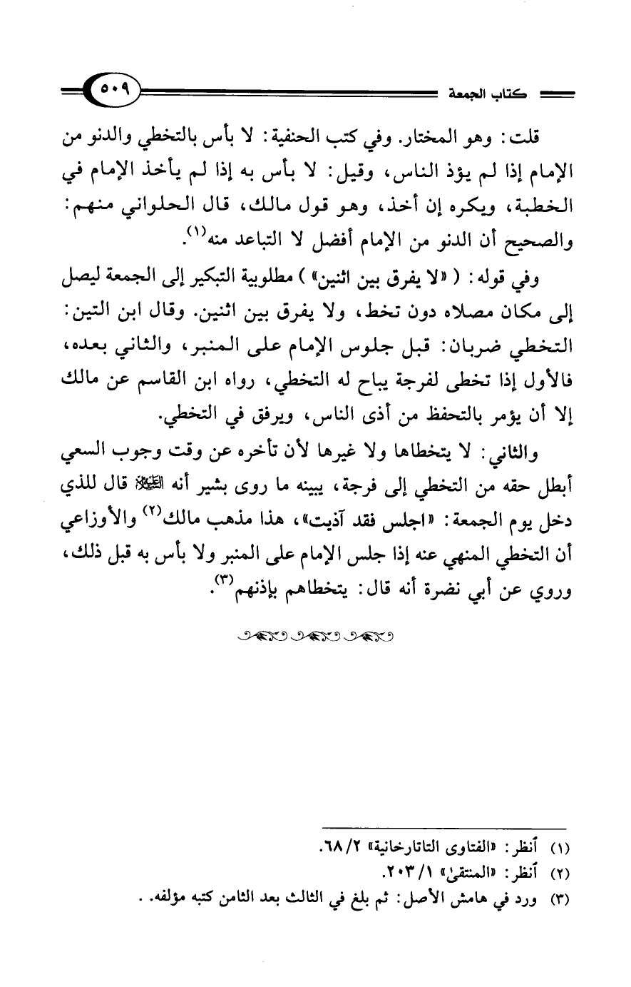 قلت: وهو المختار. وفي كتب الحنفية: لا بأس بالتخطي والدنو من الإمام إذا لم يؤذ الناس، وقيل: لا بأس به إذا لم يأخذ الإمام في الخطبة، ويكره إن أخذ، وهو قول مالك، قال الحلواني منهم: والصحيح أن الدنو من الإمام أفضل لا التباعد منه (¬1).
