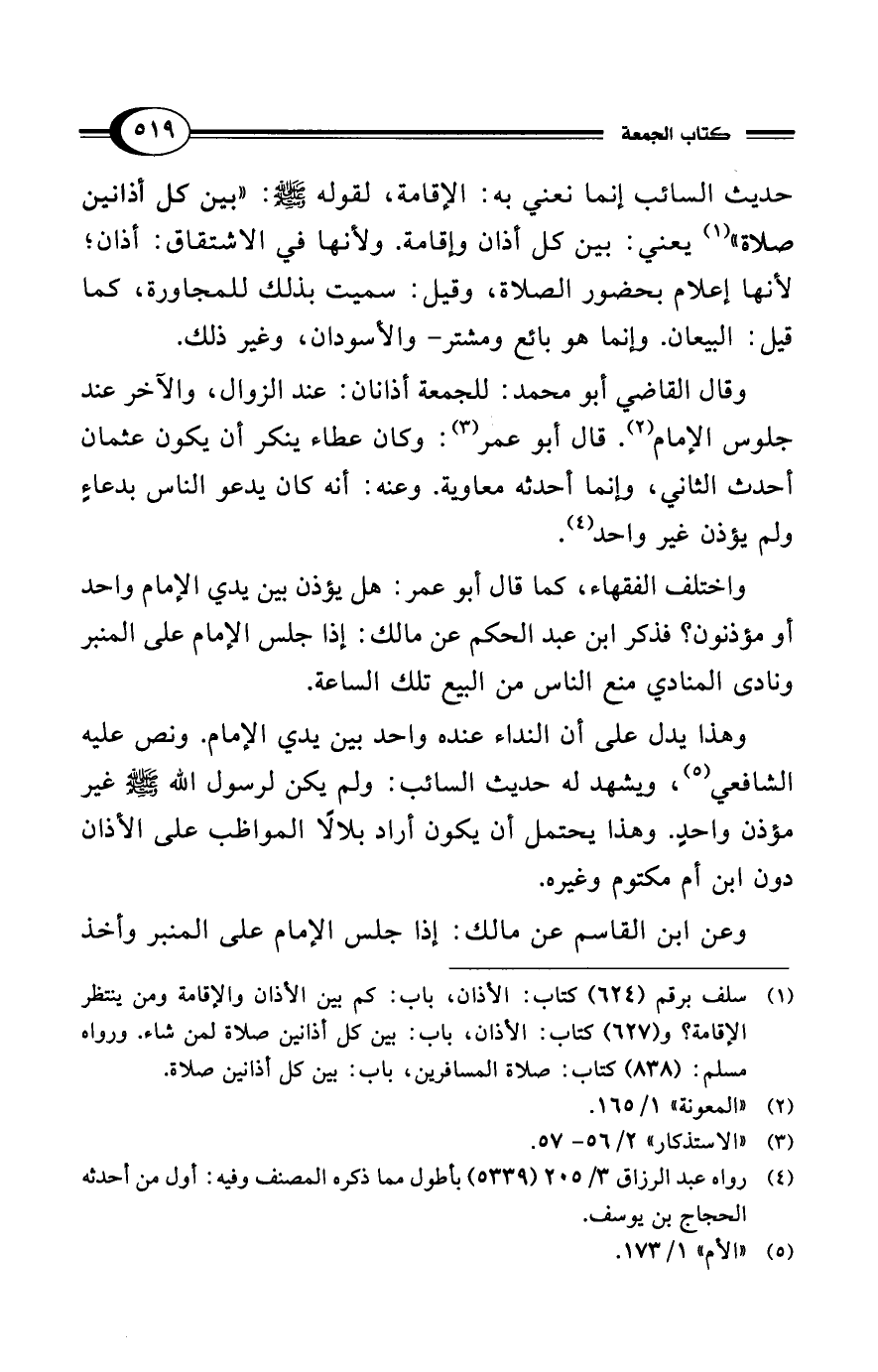 واختلف الفقهاء، كما قال أبو عمر: هل يؤذن بين يدي الإمام واحد أو مؤذنون؟ فذكر ابن عبد الحكم عن مالك: إذا جلس الإمام على المنبر ونادى المنادي منع الناس من البيع تلك الساعة.