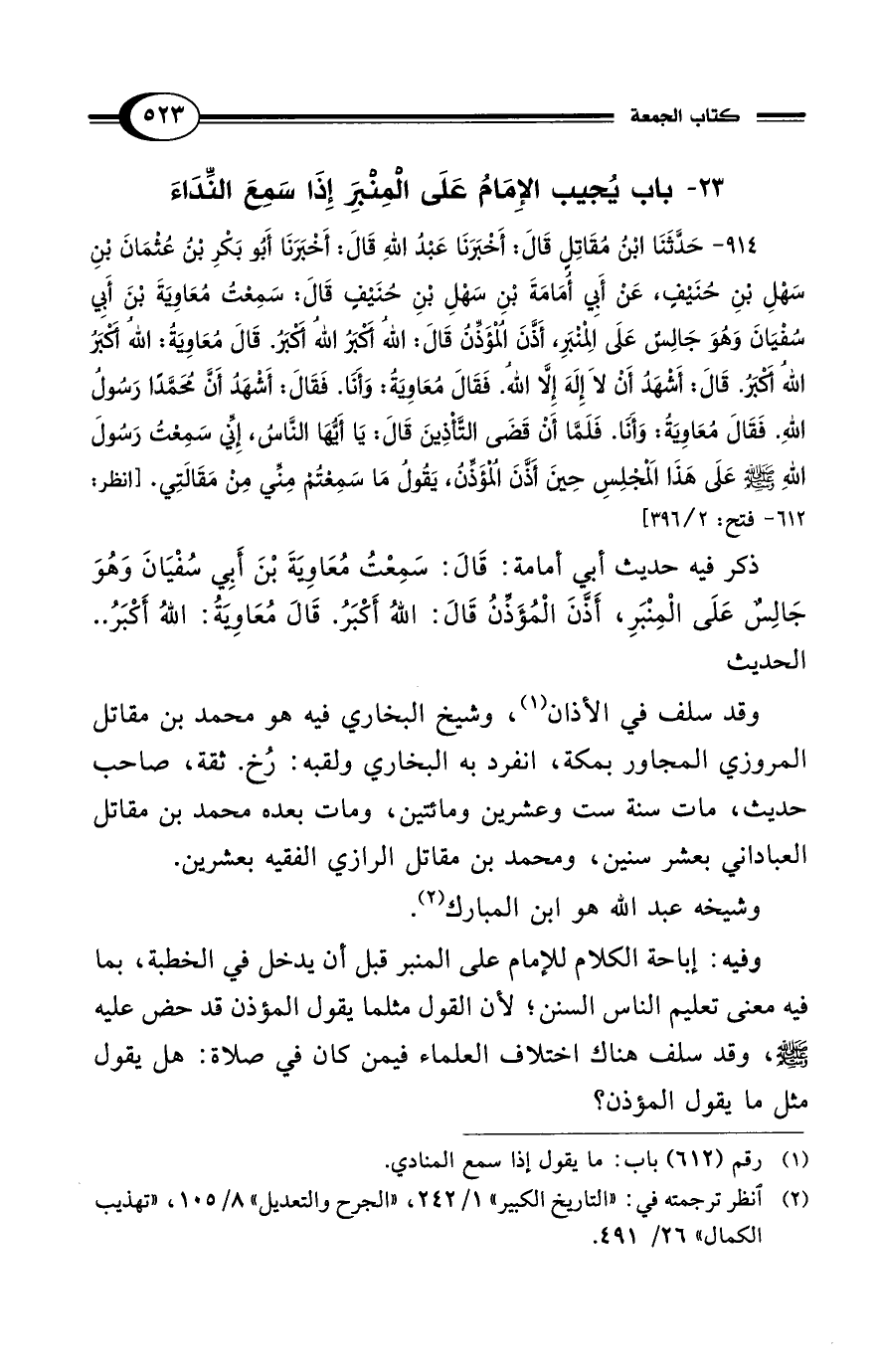 914 - حَدَّثَنَا ابْنُ مُقَاتِلٍ قَالَ: أَخْبَرَنَا عَبْدُ اللهِ قَالَ: أَخْبَرَنَا أَبُو بَكْرِ بْنُ عُثْمَانَ بْنِ سَهْلِ بْنِ حُنَيْفٍ، عَنْ أَبِي أُمَامَةَ بْنِ سَهْلِ بْنِ حُنَيْفٍ قَالَ: سَمِعْتُ مُعَاوِيَةَ بْنَ أَبِي سُفْيَانَ، وَهُوَ جَالِسٌ عَلَى المِنْبَرِ، أَذَّنَ المُؤَذِّنُ قَالَ: اللهُ أَكْبَرُ اللهُ أَكْبَرُ. قَالَ مُعَاوِيَةُ: اللهُ أَكْبَرُ اللهُ أَكْبَرُ. قَالَ: أَشْهَدُ أَنْ لاَ إِلَهَ إِلاَّ اللهُ. فَقَالَ مُعَاوِيَةُ: وَأَنَا. فَقَالَ: أَشْهَدُ أَنَّ مُحَمَّدًا رَسُولُ اللهِ. فَقَالَ مُعَاوِيَةُ: وَأَنَا. فَلَمَّا أَنْ قَضَى التَّأْذِينَ قَالَ: يَا أَيُّهَا النَّاسُ، إِنِّي سَمِعْتُ رَسُولَ اللهِ - صلى الله عليه وسلم - عَلَى هَذَا المَجْلِسِ حِينَ أَذَّنَ المُؤَذِّنُ، يَقُولُ مَا سَمِعْتُمْ مِنّي مِنْ مَقَالَتِي. [انظر: 612 - فتح: 2/ 396]