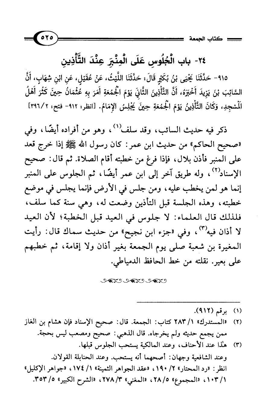 915 - حَدَّثَنَا يَحْيَى بْنُ بُكَيْرٍ قَالَ: حَدَّثَنَا اللَّيْثُ، عَنْ عُقَيْلٍ، عَنِ ابْنِ شِهَابٍ، أَنَّ السَّائِبَ بْنَ يَزِيدَ أَخْبَرَهُ، أَنَّ التَّأْذِينَ الثَّانِيَ يَوْمَ الجُمُعَةِ أَمَرَ بِهِ عُثْمَانُ حِينَ كَثُرَ أَهْلُ المَسْجِدِ، وَكَانَ التَّأْذِينُ يَوْمَ الجُمُعَةِ حِينَ يَجْلِسُ الإِمَامُ. [انظر: 912 - فتح: 2/ 396]