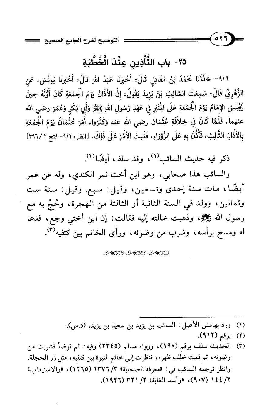 916 - حَدَّثَنَا مُحَمَّدُ بْنُ مُقَاتِلٍ قَالَ: أَخْبَرَنَا عَبْدُ اللهِ قَالَ: أَخْبَرَنَا يُونُسُ، عَنِ الزُّهْرِيِّ قَالَ: سَمِعْتُ السَّائِبَ بْنَ يَزِيدَ يَقُولُ: إِنَّ الأَذَانَ يَوْمَ الجُمُعَةِ كَانَ أَوَّلُهُ حِينَ يَجْلِسُ الإِمَامُ يَوْمَ الجُمُعَةِ عَلَى المِنْبَرِ فِي عَهْدِ رَسُولِ اللهِ - صلى الله عليه وسلم - وَأَبِى بَكْرٍ وَعُمَرَ رضي الله عنهما، فَلَمَّا كَانَ فِي خِلاَفَةِ عُثْمَانَ رضي الله عنه وَكَثُرُوا، أَمَرَ عُثْمَانُ يَوْمَ الجُمُعَةِ بِالأَذَانِ الثَّالِثِ، فَأُذِّنَ بِهِ عَلَى الزَّوْرَاءِ، فَثَبَتَ الأَمْرُ عَلَى ذَلِكَ. [انظر: 912 - فتح 2/ 396]
