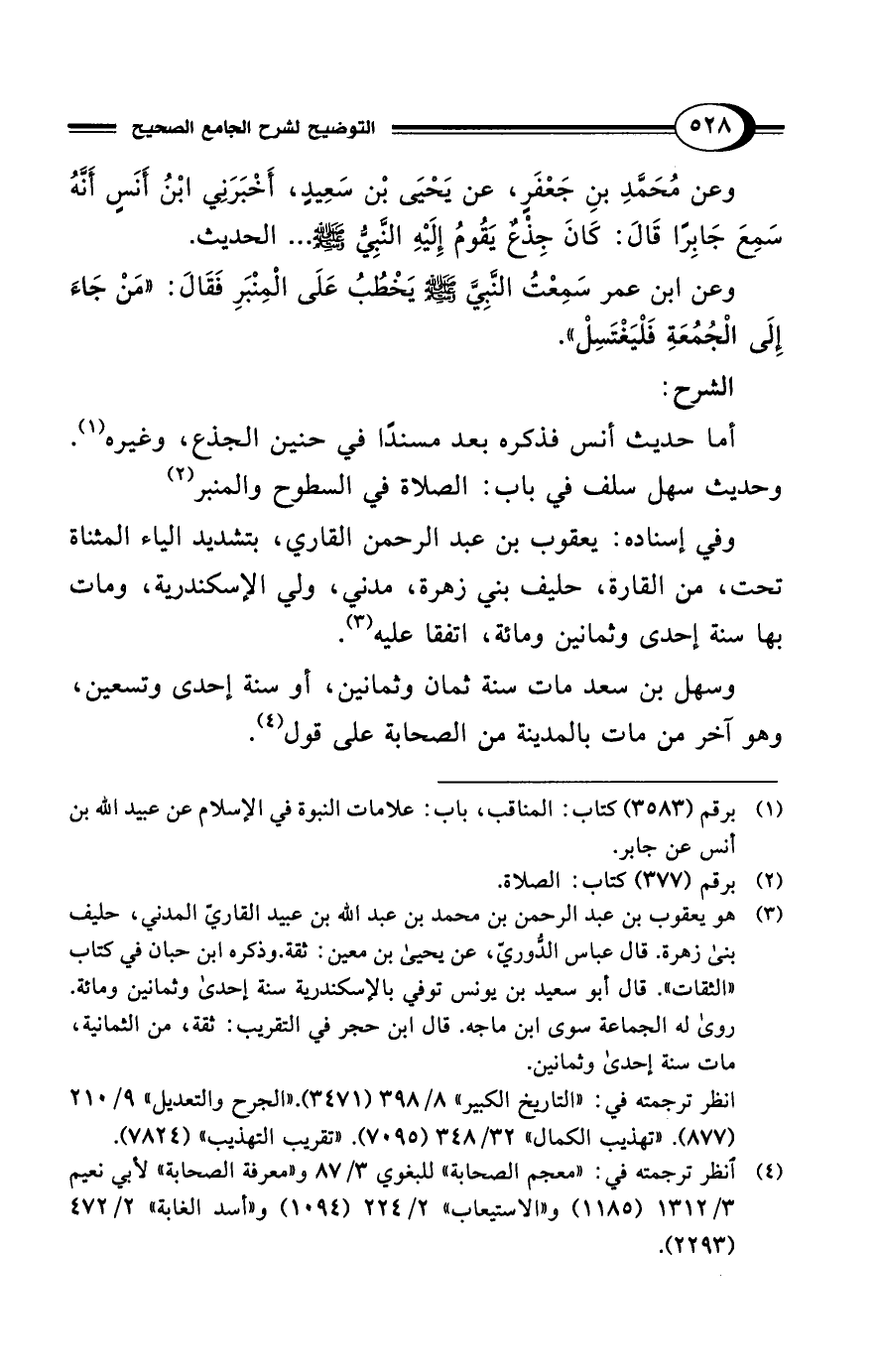 وعن مُحَمَّدِ بنِ جَعْفَرٍ، عن يَحْيَى بْن سَعِيدٍ، أَخْبَرَنِي ابْنُ أَنَسٍ أَنَّهُ سَمِعَ جَابِرًا قَالَ: كَانَ جِذْعٌ يَقُومُ إِلَيْهِ النَّبِيُّ - صلى الله عليه وسلم - ... الحديث.