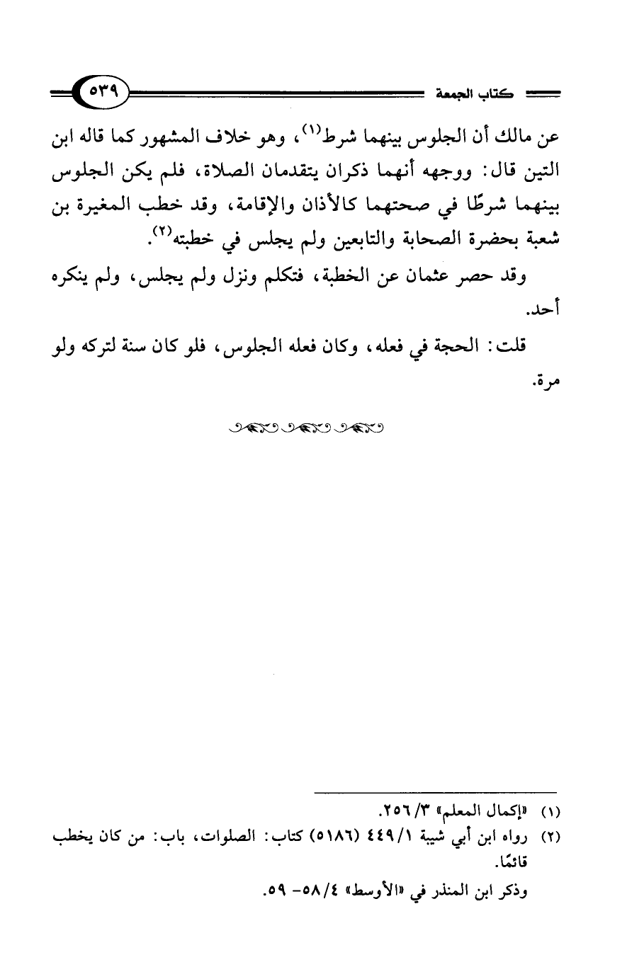 عن مالك أن الجلوس بينهما شرط (¬1)، وهو خلاف المشهور كما قاله ابن التين قال: ووجهه أنهما ذكران يتقدمان الصلاة، فلم يكن الجلوس بينهما شرطًا في صحتهما كالأذان والإقامة، وقد خطب المغيرة بن شعبة بحضرة الصحابة والتابعين ولم يجلس في خطبته (¬2).