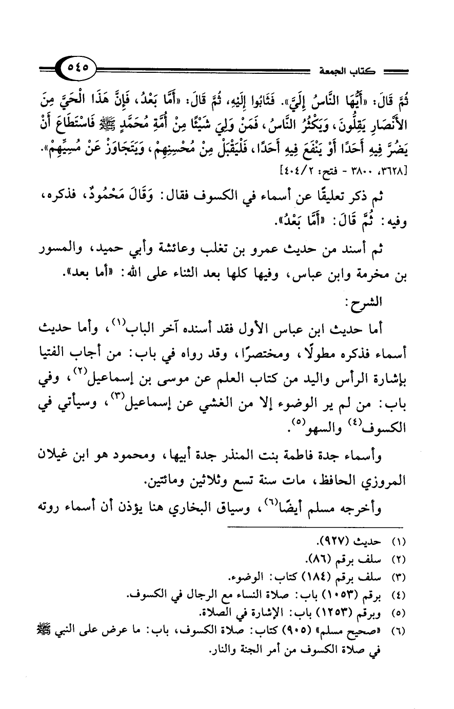 ثم ذكر تعليقًا عن أسماء في الكسوف فقال: وَقَالَ مَحْمُودٌ، فذكره، وفيه: ثُمَّ قَالَ: "أَمَّا بَعْدُ".