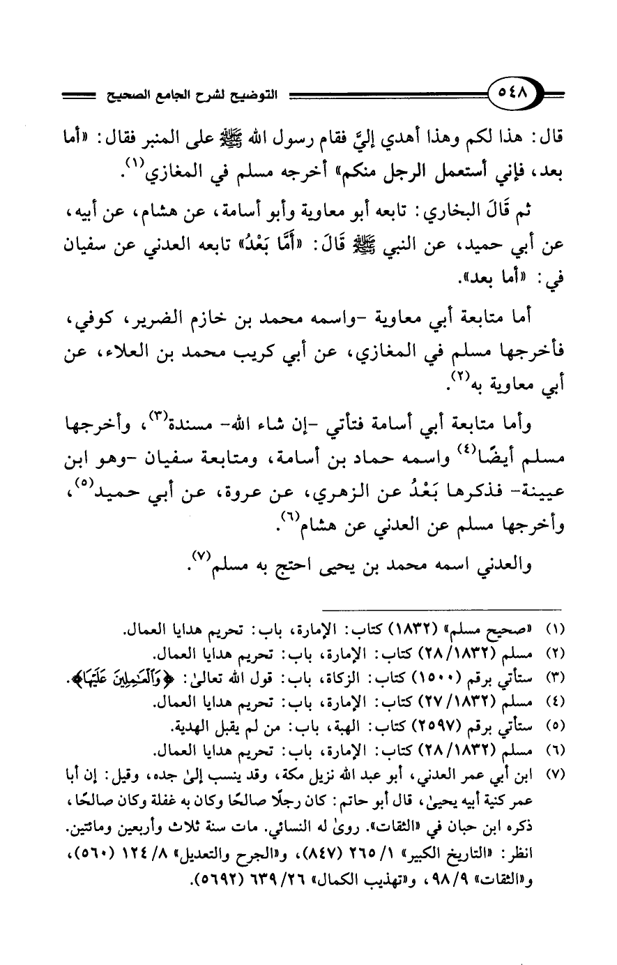 ثم قَالَ البخاري: تابعه أبو معاوية وأبو أسامة، عن هشام، عن أبيه، عن أبي حميد، عن النبي - صلى الله عليه وسلم - قَالَ: "أَمَّا بَعْدُ" تابعه العدني عن سفيان في: "أما بعد".
