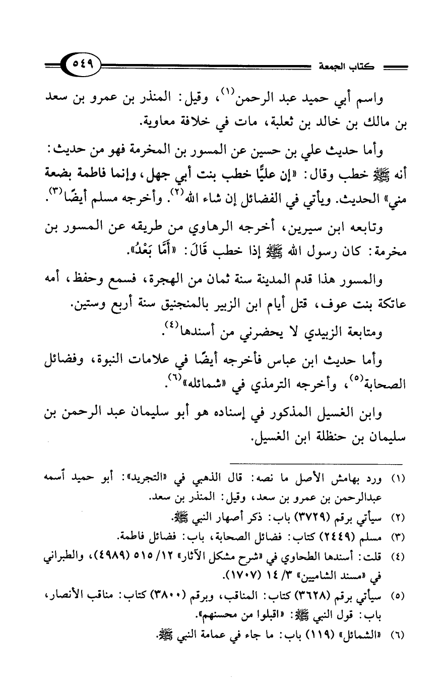 وأما حديث علي بن حسين عن المسور بن المخرمة فهو من حديث: أنه - صلى الله عليه وسلم - خطب وقال: "إن عليًّا خطب بنت أبي جهل، وإنما فاطمة بضعة مني" الحديث. ويأتي في الفضائل إن شاء الله (¬2). وأخرجه مسلم أيضًا (¬3).