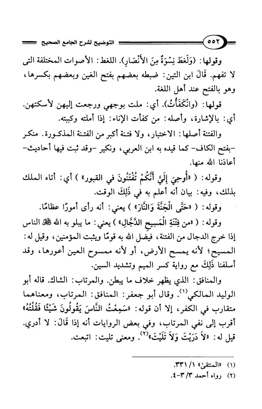 والفتنة أصلها: الاختبار، ولا فتنة أكبر من الفتنة المذكورة. منكر -بفتح الكاف- كما قيده به ابن العربي، ونكير -وقد ثبت فيها أحاديث- أعاذنا الله منها.