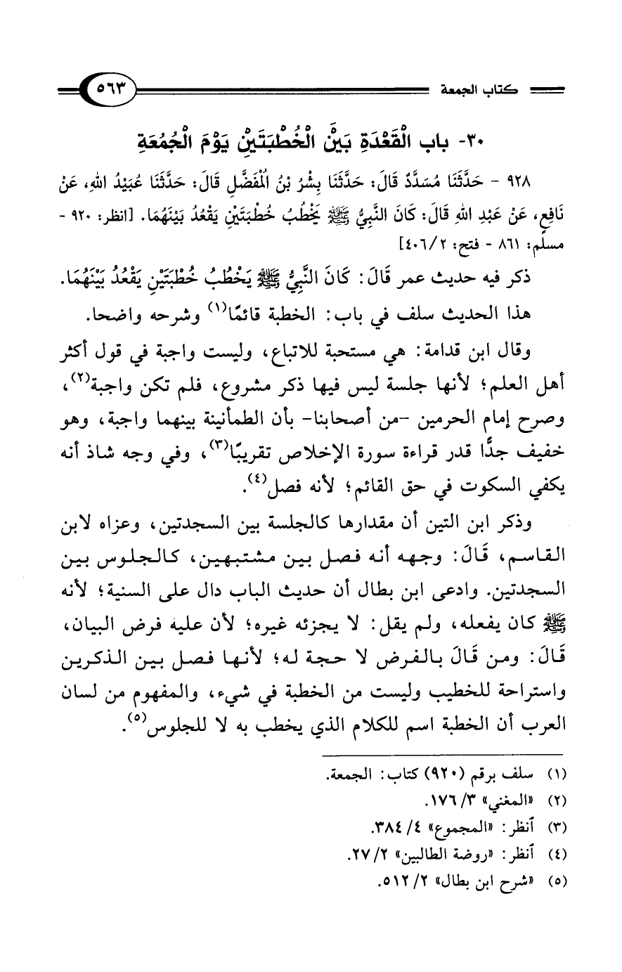 928 - حَدَّثَنَا مُسَدَّدٌ قَالَ: حَدَّثَنَا بِشْرُ بْنُ المُفَضَّلِ قَالَ: حَدَّثَنَا عُبَيْدُ اللهِ، عَنْ نَافِعٍ عَنْ عَبْدِ اللهِ قَالَ: كَانَ النَّبِيُّ - صلى الله عليه وسلم - يَخْطُبُ خُطْبَتَيْنِ يَقْعُدُ بَيْنَهُمَا. [انظر: 920 - مسلم: 861 - فتح: 2/ 406]