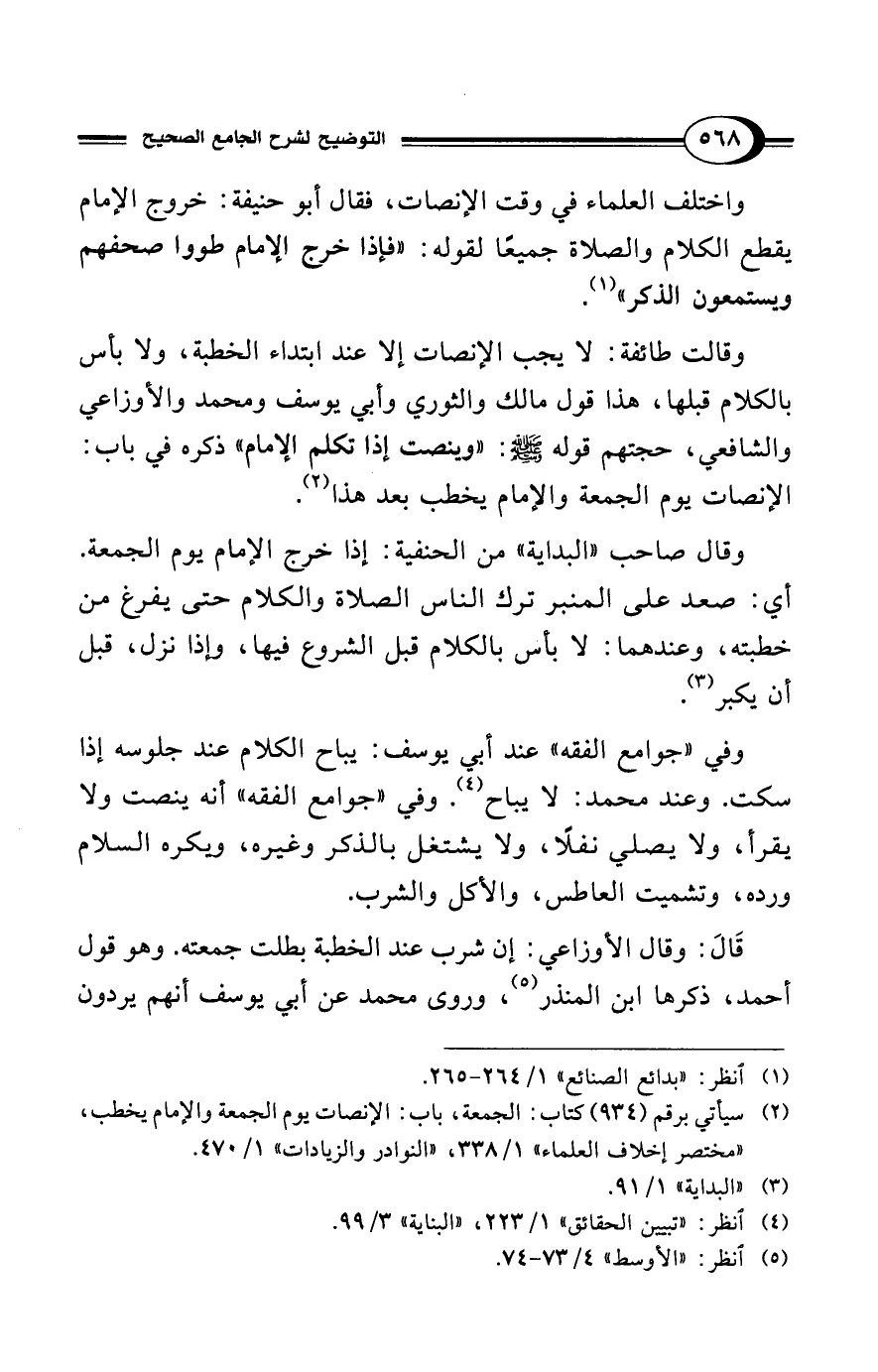 وقالت طائفة: لا يجب الإنصات إلا عند ابتداء الخطبة، ولا بأس بالكلام قبلها، هذا قول مالك والثوري وأبي يوسف ومحمد والأوزاعي والشافعي، حجتهم قوله - صلى الله عليه وسلم -: "وينصت إذا تكلم الإمام" ذكره في باب: الإنصات يوم الجمعة والإمام يخطب بعد هذا (¬2).