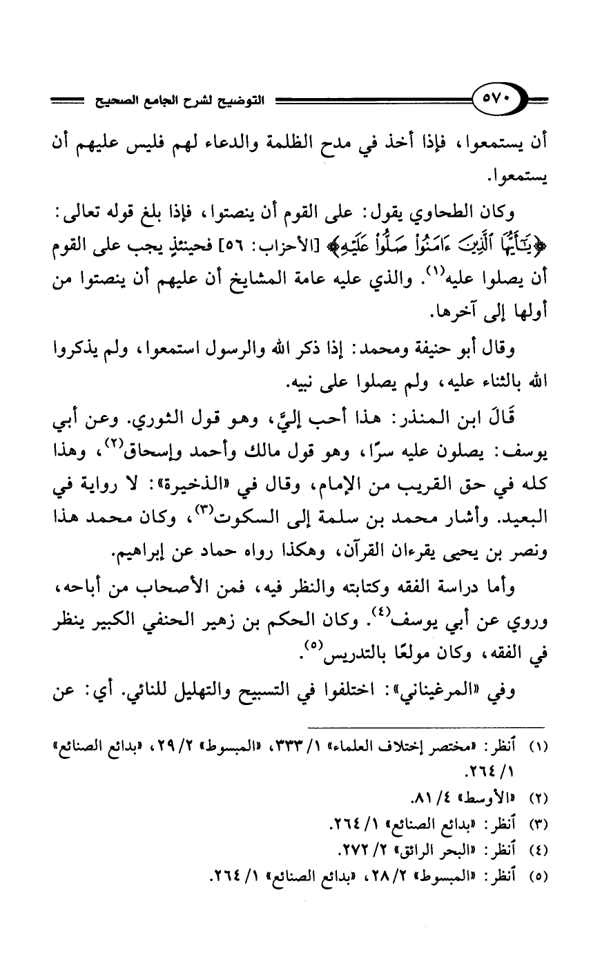 وكان الطحاوي يقول: على القوم أن ينصتوا، فإذا بلغ قوله تعالى: {يَا أَيُّهَا الَّذِينَ آمَنُوا صَلُّوا عَلَيْهِ} [الأحزاب: 56] فحينئذٍ يجب على القوم أن يصلوا عليه (¬1). والذي عليه عامة المشايخ أن عليهم أن ينصتوا من أولها إلى آخرها.