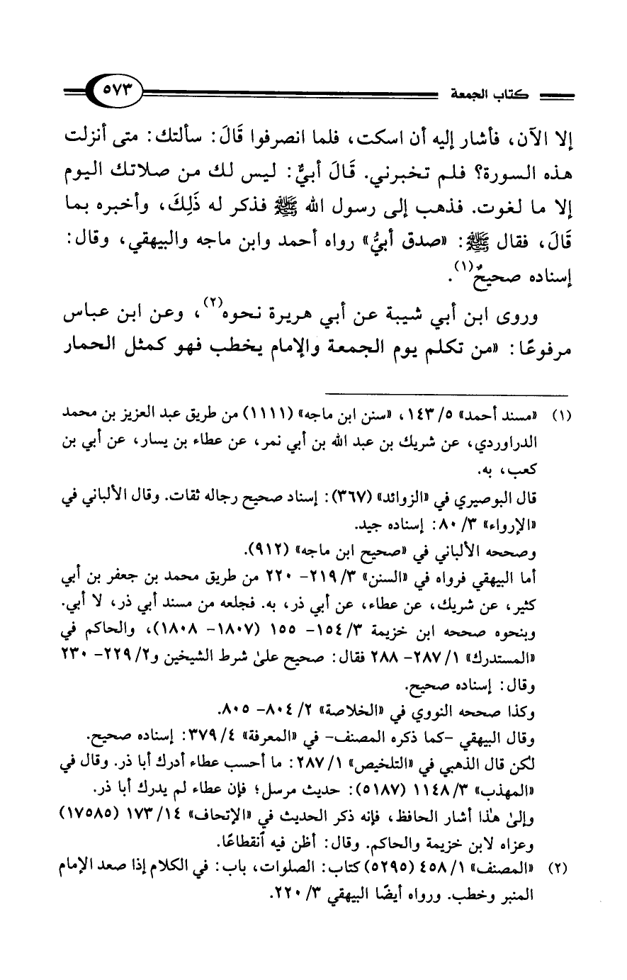 (¬2) "المصنف" 1/ 458 (5295) كتاب: الصلوات، باب: في الكلام إذا صعد الإمام المنبر وخطب. ورواه أيضًا البيهقي 3/ 220.
