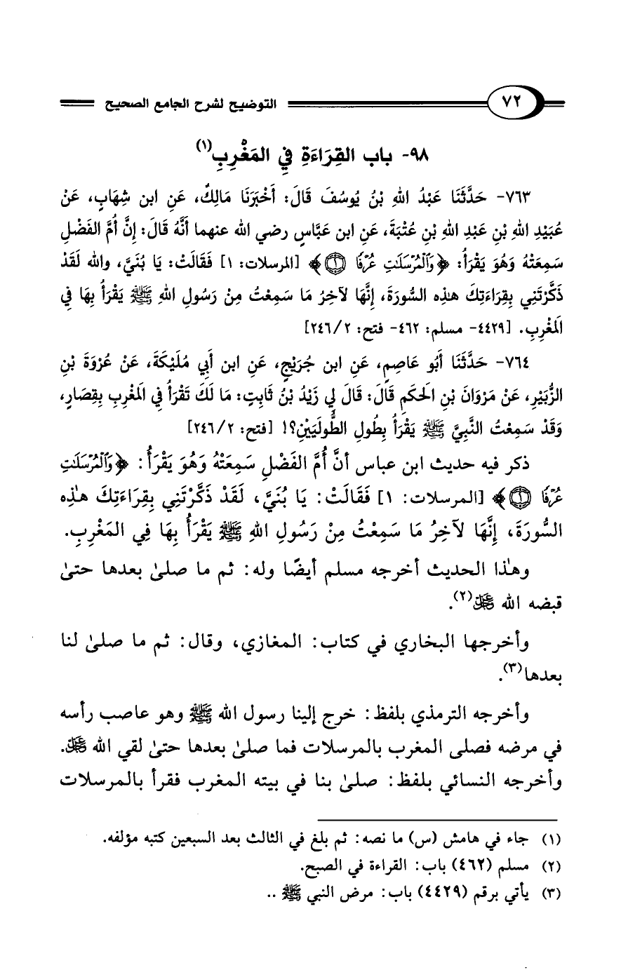 ذكر فيه حديث ابن عباس أنَّ أُمَّ الفَضْلِ سَمِعَتْهُ وَهُوَ يَقْرأُ: {وَالْمُرْسَلَاتِ عُرْفًا (1)} [المرسلات: 1] فَقَالَتْ: يَا بُنَيَّ، لَقَدْ ذَكَّرْتَنِي بِقِرَاءَتِكَ هذِه السُّورَةَ، إِنَّهَا لآخِرُ مَا سَمِعْتُ مِنْ رَسُولِ اللهِ - صلى الله عليه وسلم - يَقْرَأُ بِهَا في المَغْرِبِ.