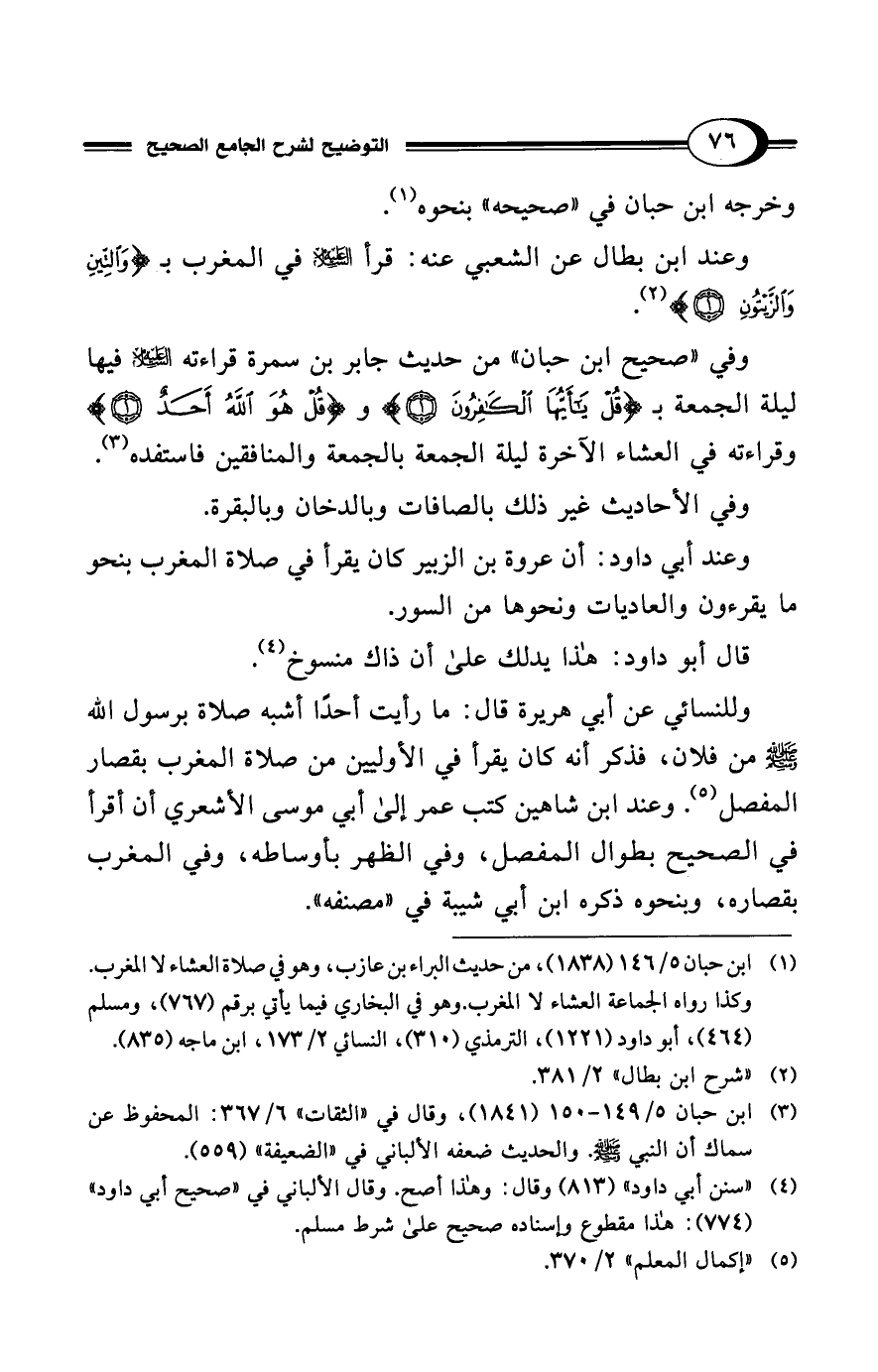 وللنسائي عن أبي هريرة قال: ما رأيت أحدًا أشبه صلاة برسول الله - صلى الله عليه وسلم - من فلان، فذكر أنه كان يقرأ في الأوليين من صلاة المغرب بقصار المفصل (¬5). وعند ابن شاهين كتب عمر إلى أبي موسى الأشعري أن أقرأ في الصحيح بطوال المفصل، وفي الظهر بأوساطه، وفي المغرب بقصاره، وبنحوه ذكره ابن أبي شيبة في "مصنفه".
