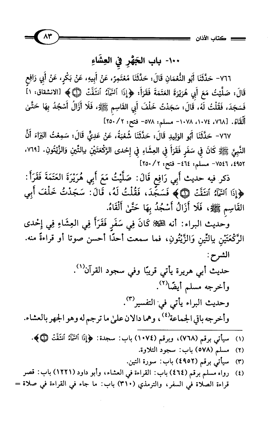 766 - حَدَّثَنَا أَبُو النُّعْمَانِ قَالَ: حَدَّثَنَا مُعْتَمِرٌ، عَنْ أَبِيهِ، عَنْ بَكْرٍ، عَنْ أَبِي رَافِعٍ قَالَ: صَلَّيْتُ مَعَ أَبِي هُرَيْرَةَ الْعَتَمَةَ فَقَرَأَ: {إِذَا السَّمَاءُ انْشَقَّتْ (1)} [الانشقاق: 1] فَسَجَدَ، فَقُلْتُ لَهُ، قَالَ: سَجَدْتُ خَلْفَ أَبِي الْقَاسِمِ - صلى الله عليه وسلم -، فَلاَ أَزَالُ أَسْجُدُ بِهَا حَتَّى أَلْقَاهُ. [768، 1074، 1078 - مسلم: 578 - فتح: 2/ 250]