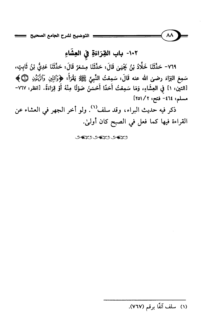 769 - حَدَّثَنَا خَلاَّدُ بْنُ يَحْيَى قَالَ: حَدَّثَنَا مِسْعَرٌ قَالَ: حَدَّثَنَا عَدِيُّ بْنُ ثَابِتٍ، سَمِعَ الْبَرَاءَ - رضي الله عنه - قَالَ: سَمِعْتُ النَّبِيَّ - صلى الله عليه وسلم - يَقْرَأُ: {وَالتِّينِ وَالزَّيْتُونِ (1)} [التين: 1] فِي العِشَاءِ، وَمَا سَمِعْتُ أَحَدًا أَحْسَنَ صَوْتًا مِنْهُ أَوْ قِرَاءَةً. [انظر: 767 - مسلم: 464 - فتح: 2/ 251]