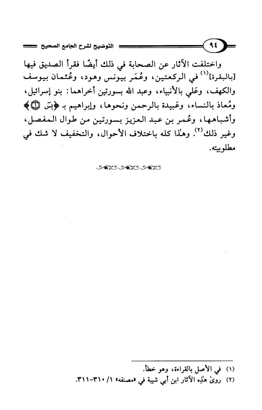 واختلفت الآثار عن الصحابة في ذلك أيضًا فقرأ الصديق فيها [بالبقرة] (¬1) في الركعتين، وعُمَر بيونس وهود، وعُثمان بيوسف والكهف، وعَلي بالأنبياء، وعبد الله بسورتين أخراهما: بنو إسرائيل، ومُعاذ بالنساء، وعَبيدة بالرحمن ونحوها، وإبراهيم بـ {يس (1)} وأشباهها، وعُمر بن عبد العزيز بسورتين من طوال المفصل، وغير ذلك (¬2). وهذا كله باختلاف الأحوال، والتخفيف لا شك في مطلوبيته.