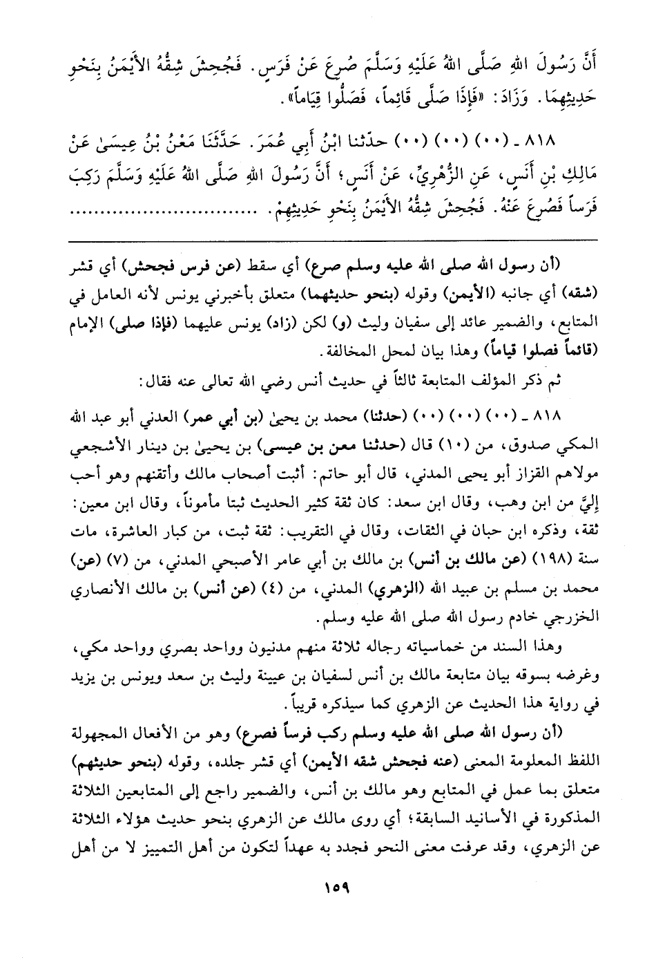 ٨١٨ - (٠٠) (٠٠) (٠٠) حَدَّثَنَا ابْنُ أَبِي عُمَرَ. حَدَّثَنَا مَعْنُ بْنُ عِيسَى عَنْ مَالِكِ بْنِ أَنَسٍ، عَنِ الزُّهْرِيِّ، عَنْ أَنَسٍ؛ أَنَّ رَسُولَ اللَّهِ صلى الله عليه وسلم رَكِبَ فَرَسًا فَصُرِعَ عَنْهُ. فَجُحِشَ شِقُّهُ الأَيمَنُ بِنَحْو حَدِيثِهِمْ