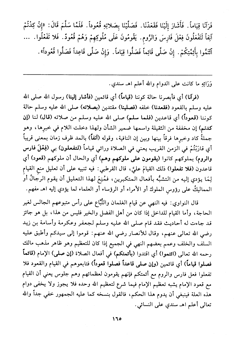 فَرَآنَا قِيَامًا. فَأَشَارَ إِلَينَا فَقَعَدْنَا. فَصَلَّينَا بِصَلاتِهِ قُعُودًا. فَلَمَّا سَلَّمَ قَال: "إِنْ كِدْتُمْ آنِفًا لَتَفْعَلُونَ فِعْلَ فَارِسَ وَالرُّومِ. يَقُومُونَ عَلَى مُلُوكِهِمْ وَهُمْ قُعُودٌ. فَلَا تَفْعَلُوا. ... ائْتَمُّوا بِأَئِمَّتِكُمْ. إِنْ صَلَّى قَائِمًا فَصَلُّوا قِيَامًا. وَإِنْ صَلَّى قَاعِدًا فَصَلُّوا قُعُودًا"