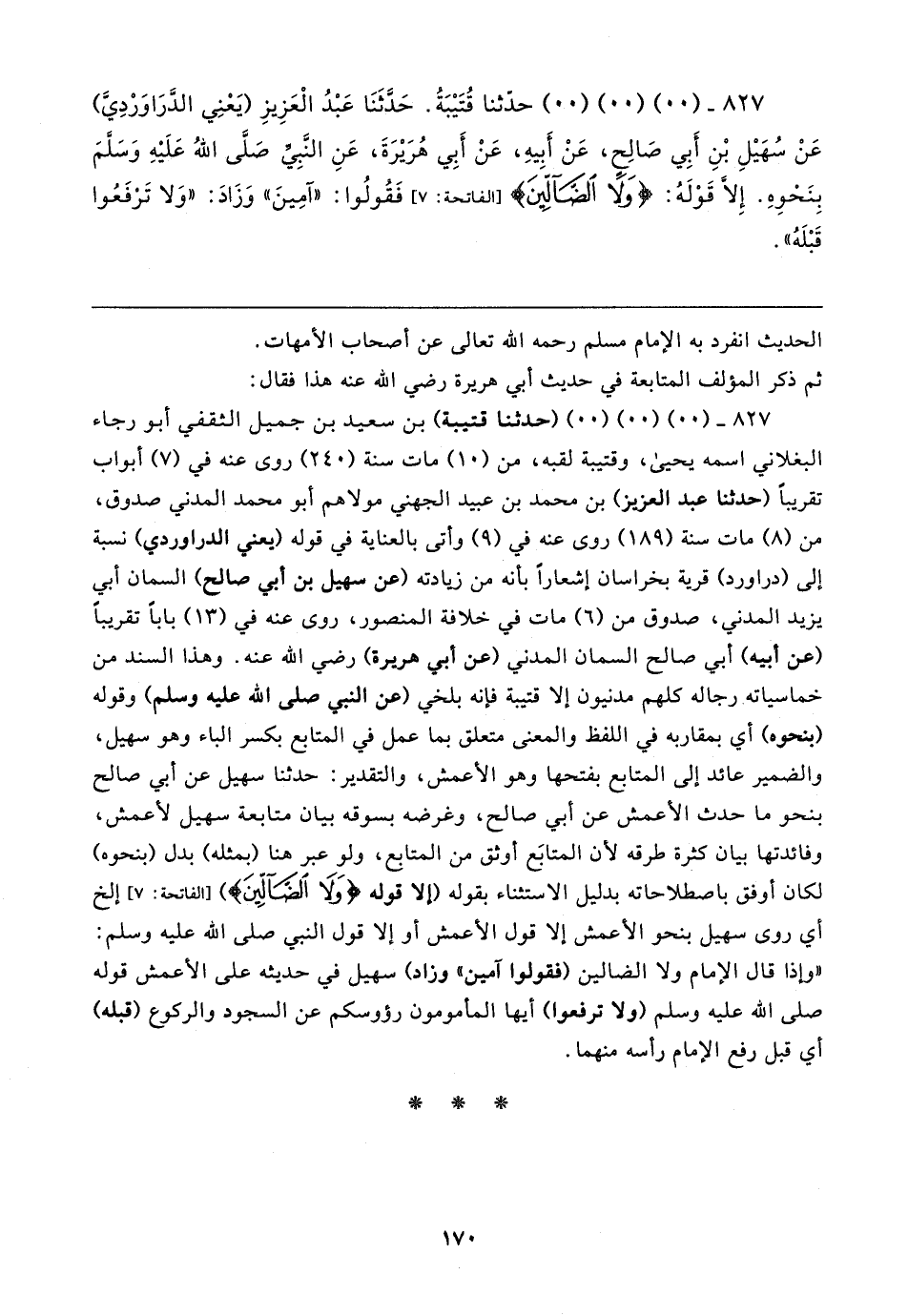 ٨٢٧ - (٠٠) (٠٠) (٠٠) (حدثنا قتيبة) بن سعيد بن جميل الثقفي أبو رجاء البغلاني اسمه يحيى، وقتيبة لقبه، من (١٠) مات سنة (٢٤٠) روى عنه في (٧) أبواب تقريبًا (حدثنا عبد العزيز) بن محمد بن عبيد الجهني مولاهم أبو محمد المدني صدوق، من (٨) مات سنة (١٨٩) روى عنه في (٩) وأتى بالعناية في قوله (يعني الدراوردي) نسبة إلى (دراورد) قرية بخراسان إشعارًا بأنه من زيادته (عن سهيل بن أبي صالح) السمان أبي يزيد المدني، صدوق من (٦) مات في خلافة المنصور، روى عنه في (١٣) بابًا تقريبًا (عن أبيه) أبي صالح السمان المدني (عن أبي هريرة) رضي الله عنه. وهذا السند من خماسياته. رجاله كلهم مدنيون إلا قتيبة فإنه بلخي (عن النبي صلى الله عليه وسلم) وقوله (بنحوه) أي بمقاربه في اللفظ والمعنى متعلق بما عمل في المتابع بكسر الباء وهو سهيل، والضمير عائد إلى المتابع بفتحها وهو الأعمش، والتقدير: حدثنا سهيل عن أبي صالح بنحو ما حدث الأعمش عن أبي صالح، وغرضه بسوقه بيان متابعة سهيل لأعمش، وفائدتها بيان كثرة طرقه لأن المتابَع أوثق من المتابع، ولو عبر هنا (بمثله) بدل (بنحوه) لكان أوفق باصطلاحاته بدليل الاستثناء بقوله (إلا قوله {وَلَا الضَّالِّينَ}) [الفاتحة: ٧] إلخ أي روى سهيل بنحو الأعمش إلا قول الأعمش أو إلا قول النبي صلى الله عليه وسلم: "وإذا قال الإمام ولا الضالين (فقولوا آمين" وزاد) سهيل في حديثه على الأعمش قوله صلى الله عليه وسلم (ولا ترفعوا) أيها المأمومون رؤوسكم عن السجود والركوع (قبله) أي قبل رفع الإمام رأسه منهما.