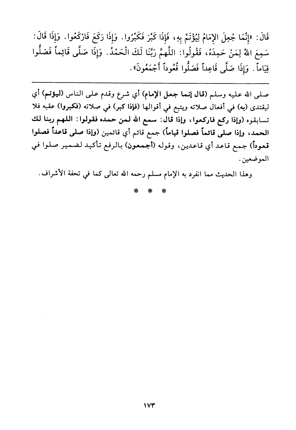 قَال: "إِنَّمَا جُعِلَ الإِمَامُ لِيُؤْتَمَّ بِهِ, فَإِذَا كَبَّرَ فَكَبِّرُوا. وَإِذَا رَكَعَ فَارْكَعُوا. وَإِذَا قَال: سَمِعَ اللَّهُ لِمَنْ حَمِدَهُ , فَقُولُوا: اللَّهُمَّ رَبَّنَا لَكَ الْحَمْدُ. وَإِذَا صَلَّى قَائِمًا فَصَلُّوا قِيَامًا. وَإِذَا صَلَّى قَاعِدًا فَصَلُّوا قُعُودًا أَجْمَعُونَ"