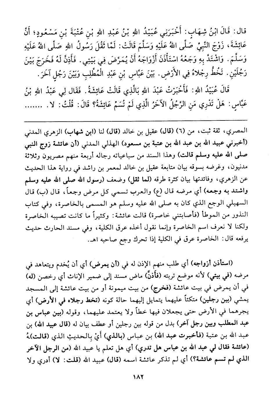 قال: قَال ابْنُ شِهَابٍ: أَخْبَرَنِي عُبَيدُ اللَّهِ بْنُ عَبْدِ اللَّهِ بْنِ عُتْبَةَ بْنِ مَسْعُودٍ؛ أَنَّ عَائِشَةَ، زَوْجَ النَّبِيِّ صلى الله عليه وسلم قَالتْ: لَمَّا ثَقُلَ رَسُولُ اللَّهِ صلى الله عليه وسلم. وَاشْتَدَّ بِهِ وَجَعُهُ اسْتَأْذَنَ أَزْوَاجَهُ أَنْ يُمَرَّضَ فِي بَيتِي. فَأَذِنَّ لَهُ فَخَرَجَ بَينَ رَجُلَينِ. تَخُطُّ رِجْلاهُ فِي الأَرْضِ. بَينَ عَبَّاسِ بْنِ عَبْدِ الْمُطَّلِبِ وَبَينَ رَجُلٍ آخَرَ. قَال عُبَيدُ اللَّهِ: فَأَخْبَرْتُ عَبْدَ اللَّهِ بِالَّذِي قَالتْ عَائِشَةُ. فَقَال لِي عَبْدُ اللَّهِ بْنُ عَبَّاسٍ: هَلْ تَدْرِي مَنِ الرَّجُلُ الآخَرُ الَّذِي لَمْ تُسَمِّ عَائِشَةُ؟ قَال: قُلْتُ: لَا