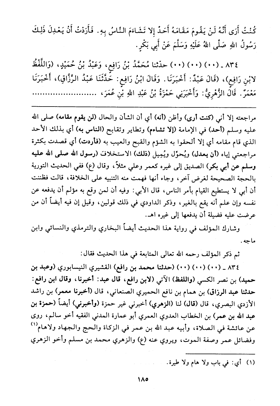 ٨٣٤ - (٠٠) (٠٠) (٠٠) (حدثنا محمد بن رافع) القشيري النيسابوري (وعبد بن حميد) بن نصر الكسي (واللفظ) الآتي (لابن رافع، قال عبد: أخبرنا، وقال ابن رافع: حدثنا عبد الرزاق) بن همام بن نافع الحميري الصنعاني، قال (أخبرنا معمر) بن راشد الأزدي البصري، قال (قال) لنا (الزهري) أخبرني غير حمزة (وأخبرني) أيضًا (حمزة بن عبد الله بن عمر) بن الخطاب العدوي العمري أبو عمارة المدني الفقيه أخو سالم، روى عن عائشة في الصلاة، وأبيه عبد الله بن عمر في الزكاة والحج والجهاد ولاهام (١) وفضائل عمر وصفة الموت، ويروي عنه (ع) والزهري محمد بن مسلم وأخو الزهري