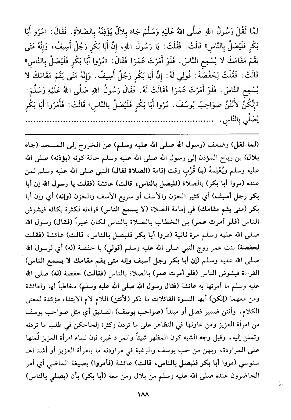لَمَّا ثَقُلَ رَسُولُ اللَّهِ صلى الله عليه وسلم جَاءَ بِلالٌ يُؤْذِنُهُ بِالصَّلاةِ. فَقَال: "مُرُوا أَبَا بَكْرٍ فَلْيُصَلِّ بِالنَّاسِ" قَالتْ: فَقُلْتُ: يَا رَسُولَ اللَّهِ, إِنَّ أَبَا بَكْرٍ رَجُلٌ أَسِيفٌ, وَإِنَّهُ مَتَى يَقُمْ مَقَامَكَ لَا يُسْمِعِ النَّاسَ. فَلَوْ أَمَرْتَ عُمَرَ! فَقَال: "مُرُوا أَبَا بَكْرٍ فَلْيُصَلِّ بِالنَّاسِ" قَالتْ: فَقُلْتُ لِحَفْصَةَ: قُولِي لَهُ: إِنَّ أَبَا بَكْرٍ رَجُلٌ أَسِيفٌ. وَإِنَّهُ مَتَى يَقُمْ مَقَامَكَ لَا يُسْمِعِ النَّاسَ. فَلَوْ أَمَرْتَ عُمَرَ! فَقَالتْ لَهُ. فَقَال رَسُولُ اللَّهِ صلى الله عليه وسلم: "إِنَّكُنَّ لأَنْتُنَّ صَوَاحِبُ يُوسُفَ. مُرُوا أَبَا بَكْرٍ فَلْيُصَلِّ بِالنَّاسِ". قَالتْ: فَأَمَرُوا أَبَا بَكْرٍ يُصَلِّي بِالنَّاسِ