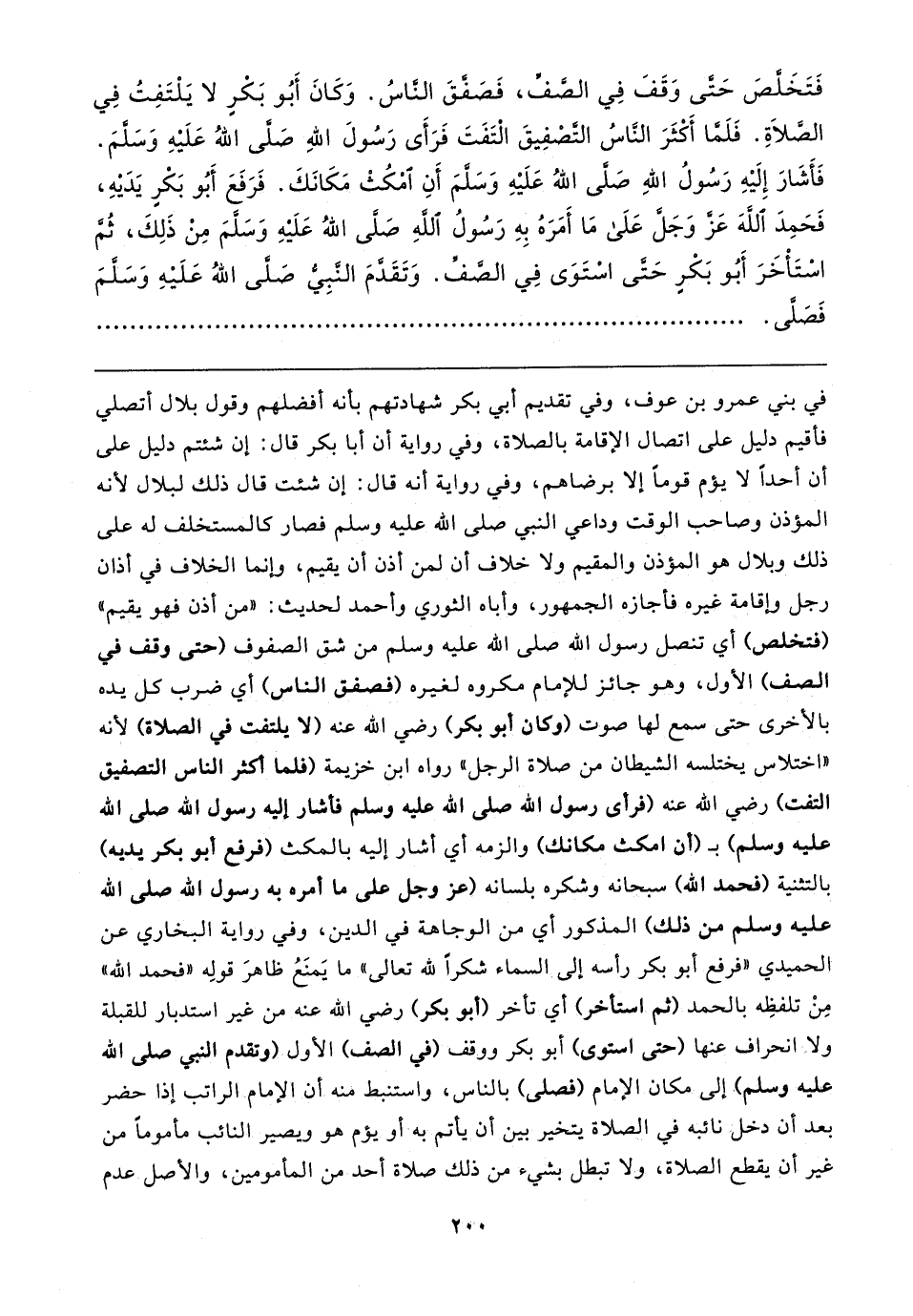 فَتَخَلَّصَ حَتَّى وَقَفَ في الصَّفِّ، فَصَفَّقَ النَّاسُ. وَكَانَ أَبُو بَكرٍ لا يَلْتَفِتُ في الصلَاةِ. فَلَمَّا أَكْثَرَ النَّاسُ التَّصْفِيقَ الْتَفَتَ فَرَأَى رَسُولَ اللهِ صَلَّى اللهُ عَلَيهِ وَسَلَّمَ. فَأَشَارَ إِلَيهِ رَسُولُ اللهِ صَلَّى اللهُ عَلَيهِ وَسَلَّمَ أَنِ امْكُثْ مَكَانَكَ. فَرَفَعَ أَبُو بَكْرٍ يَدَيهِ، فَحَمِدَ اللهَ عَزَّ وَجَلَّ عَلَى مَا أمَرَهُ بِهِ رَسُولُ اللهِ صَلَّى اللهُ عَلَيهِ وَسَلَّمَ مِنْ ذَلِكَ، ثُمَّ اسْتَأْخَرَ أبُو بَكْرٍ حَتَّى اسْتَوَى في الصَّفِّ. وَتَقَدَّمَ النَّبِيُّ صَلَّى اللهُ عَلَيهِ وَسَلَّمَ فَصَلَّى