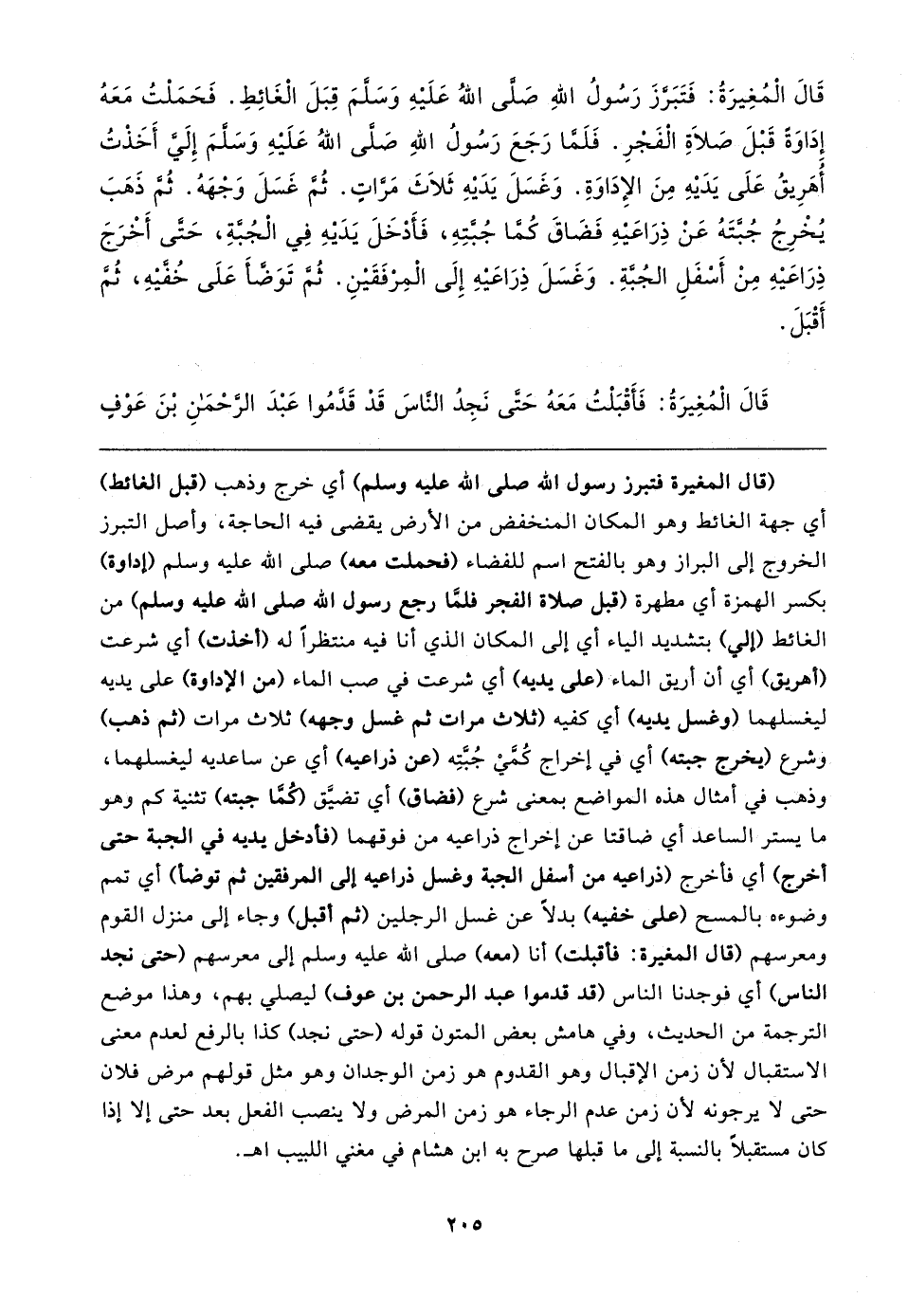 قَال الْمُغِيرَةُ: فَتَبَرَّزَ رَسُولُ اللهِ صَلَّى اللهُ عَلَيهِ وَسَلَّمَ قِبَلَ الْغَائِطِ. فَحَمَلْتُ مَعَهُ إِدَاوَةً قَبْلَ صَلَاةِ الفَجْرِ. فَلَمَّا رَجَعَ رَسُولُ اللهِ صَلَّى اللهُ عَلَيهِ وَسَلَّمَ إِلَيَّ أَخَذْتُ أُهَرِيقُ عَلَى يَدَيهِ مِنَ الإِدَاوَةِ. وَغَسَلَ يَدَيهِ ثَلَاثَ مَرَّاتٍ. ثُمَّ غَسَلَ وَجْهَهُ. ثُمَّ ذَهَبَ يُخْرِجُ جُبَّتَهُ عَنْ ذِرَاعَيهِ فَضَاقَ كُمَّا جُبَّتِهِ، فَأَدْخَلَ يَدَيه في الْجُبَّةِ، حَتَّى أَخْرَجَ ذِرَاعَيهِ مِنْ أَسْفَلِ الجُبَّةِ. وَغَسَلَ ذِرَاعَيهِ إِلَى الْمِرْفَقَينِ. ثُمَّ تَوَضَّأْ عَلَى خُفَّيهِ، ثُمَّ أَقْبَلَ.