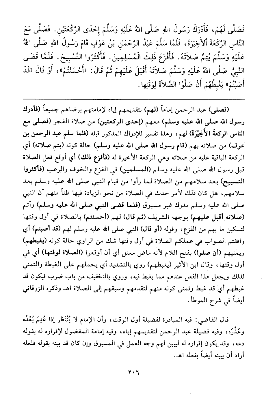 فَصَلَّى لَهُمْ، فَأَدْرَكَ رَسُولُ اللهِ صَلَّى اللهُ عَلَيهِ وَسَلَّمَ إِحْدَى الرَّكْعَتَينِ. فَصَلَّى مَعَ الناسِ الرَّكْعَةَ الأَخِيَرَةَ، فَلَمَّا سَلَّمَ عَبْدُ الرَّحْمَنِ بْنُ عَوْفٍ قَامَ رَسُولُ اللهِ صَلَّى اللهُ عَلَيهِ وَسَلَّمَ يُتِمُّ صَلاتَهُ. فَأَفْزَعَ ذَلِكَ الْمُسْلِمِينَ. فَأَكْثَرُوا التَّسْبِيحَ. فَلَمَّا قَضَى النَّبِيُّ صَلَّى اللهُ عَلَيهِ وَسَلَّمَ صَلاتَهُ أَقْبَلَ عَلَيهِمْ ثُمَّ قَال: "أَحْسَنْتُمْ"، أَوْ قَال "قَدْ أَصَبْتُمْ" يَغْبِطُهُمْ أَنْ صَلُّوُا الصَّلاةَ لِوَقْتِها