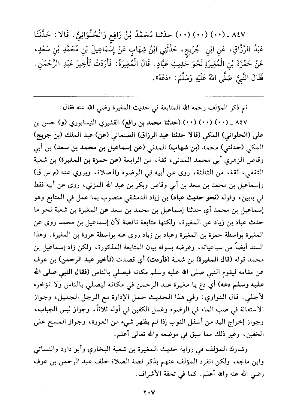 ٨٤٧ - (٠٠) (٠٠) (٠٠) حدَّثنا مُحَمَّدُ بْنُ رَافِعٍ وَالْحُلْوَانِيُّ. قَالا: حَدَّثَنَا عَبْدُ الرَّزَاقِ، عَنِ ابْنِ جُرَيجٍ، حَدَّثَنِي ابْنُ شِهَابِ عَنْ إِسْمَاعِيلَ بْنِ مُحَمَّدِ بْنِ سَعْدٍ، عَنْ حَمْزَةَ بْنِ الْمُغِيرَةِ نَحْوَ حَدِيثِ عَبَّادٍ. قَال الْمُغِيرَةُ: فَأَرَدْتُ تَأخِيرَ عَبْدِ الرَّحْمَنِ. فَقَال النَّبِي صَلَّى اللهُ عَلَيهِ وَسَلَّمَ: "دَعْهُ"
