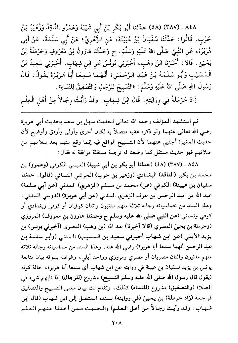 ٨٤٨ - (٣٨٧) (٤٨) حدَّثنا أَبُو بَكْرٍ بْنُ أَبِي شَيبَةَ وَعَمْرٌو النَّاقِدُ وَزُهَيرُ بْنُ حَرْبٍ. قَالُوا: حَدَّثَنَا سُفْيَانُ بْنُ عُيَينَةَ، عَنِ الزُّهْرِي؛ عَنْ أَبِي سَلَمَةَ، عَنْ أَبِي هُرَيرَةَ، عَنِ النَّبِيِّ صَلَّى اللْهُ عَلَيهِ وسَلَّمَ. ح وَحدَّثَنَا هَارُونُ بن مَعْرُوفٍ وَحَرْمَلَةُ بن يَحْيَى. قَالا: أَخْبَرَنَا ابْنُ وَهْب، أخبَرَنِي يُونُسُ عَنِ ابْنِ شِهَاب. أَخْبَرَنِي سَعِيدُ بن الْمُسَيبِ وَأَبُو سَلَمَةَ بن عَبدِ الرَّحْمَنِ؛ أَنَّهُمَا سَمِعَا أَبَا هُرَيرَةَ يَقُولُ: قَال رَسُولُ اللهِ صَلَّى اللهُ عَلَيهِ وَسَلَّمَ: "التَّسْبِيحُ لِلرِّجَالِ وَالتَّصْفِيقُ لِلنِّسَاءِ".