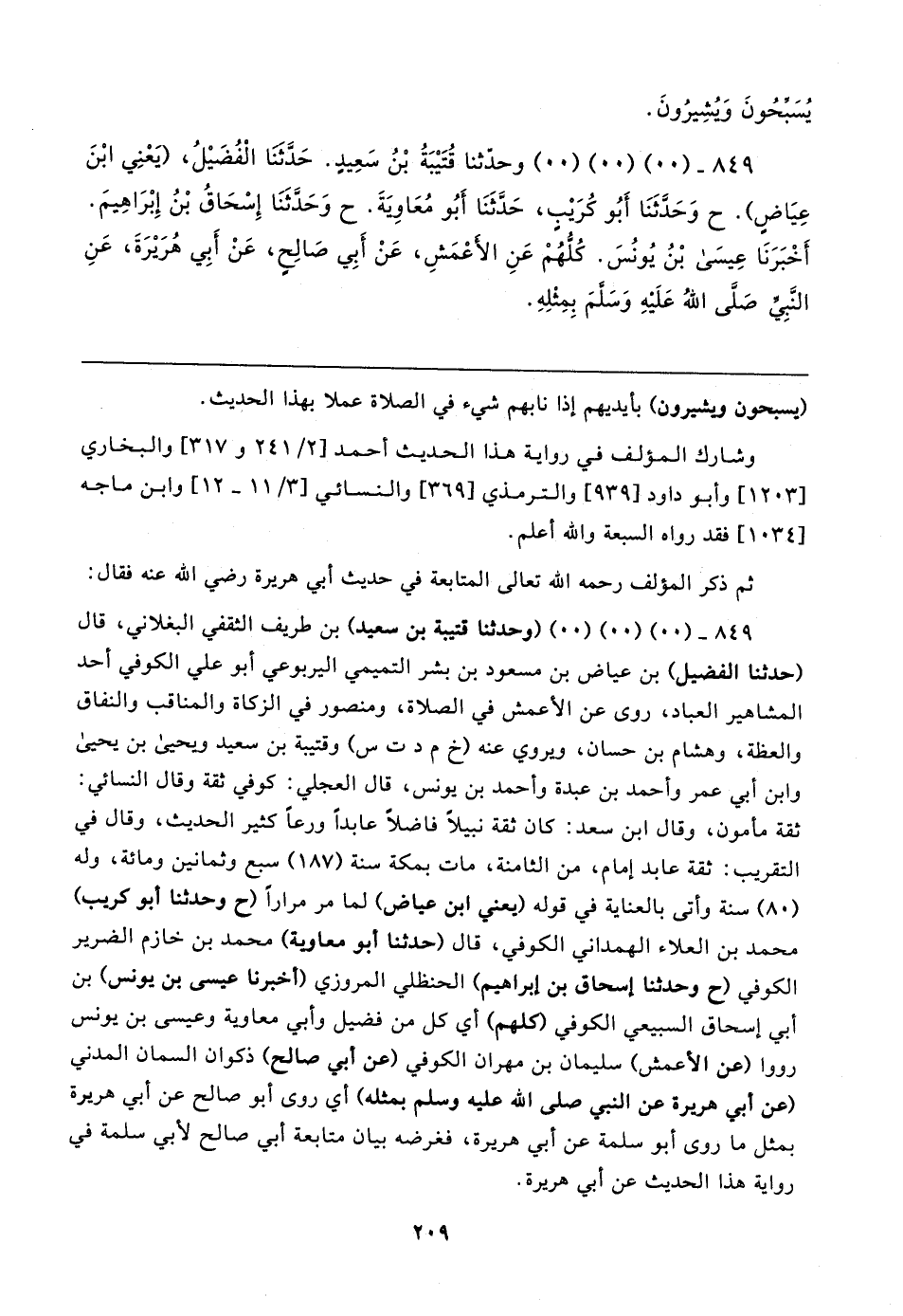 ٨٤٩ - (٠٠) (٠٠) (٠٠) وحدَّثنا قُتَيبَةُ بْنُ سَعِيدٍ. حَدَّثنَا الْفُضَيلُ، (يَعْنِي ابْنَ عِيَاضٍ). ح وَحدَّثَنَا أَبُو كُرَيبٍ، حَدَّثَنَا أَبُو مُعَاويةَ. ح وَحدَّثَنَا إِسْحَاقُ بْنُ إِبْرَاهِيمَ. أَخْبَرَنَا عِيسَى بْنُ يُونُسَ. كُلُّهُمْ عَنِ الأعْمَشِ، عَنْ أَبِي صَالِحٍ، عَنْ أَبِي هُرَيرَة، عَنِ النَّبِي صَلَّى اللهُ عَلَيهِ وَسَلَّمَ بِمِثْلِهِ